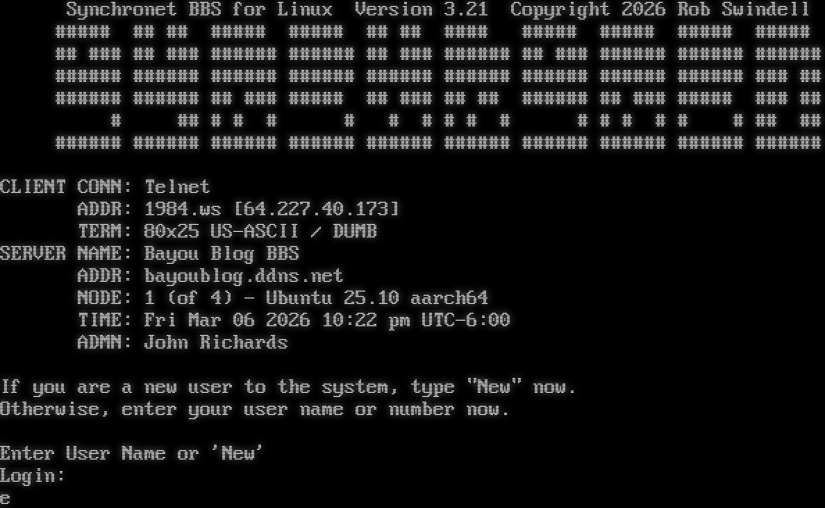 Synchronet BBS for Linux Version 3.21 Telnet connection from: 64.227.40.173 Resolving hostname... _ ∩╗┐ Synchronet BBS for Linux Version 3.21 Copyright 2026 Rob Swindell #​#### ## ## #​#### #​#### ## ## #​### #​#### #​#### #​#### #​#### ## ### ## ### #​##### #​##### ## ### #​##### ## ### #​##### #​##### #​##### #​##### #​##### #​##### #​##### #​##### #​##### #​##### #​##### #​##### ### ## #​##### #​##### ## ### #​#### ## ### ## ## #​##### ## ### #​#### ### ## # ## # # # # # # # # # # # # # # # ## ## #​##### #​##### #​##### #​##### #​##### #​##### #​##### #​##### #​##### #​##### CLIENT CONN: Telnet ADDR: 1984.ws [64.227.40.173] TERM: 80x25 US-ASCII / DUMB SERVER NAME: Bayou Blog BBS ADDR: bayoublog.ddns.net NODE: 1 (of 4) - Ubuntu 25.10 aarch64 TIME: Fri Mar 06 2026 10:22 pm UTC-6:00 ADMN: John Richards If you are a new user to the system, type "New" now. Otherwise, enter your user name or number now. Enter User Name or 'New' Login: Bee