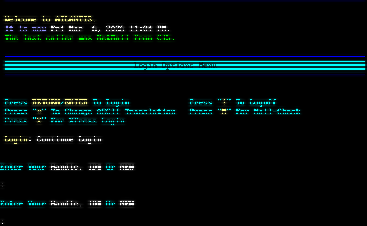 ATA CONNECTION CONFIRMED: 38400 ANSI/Graphics Detected Are You in 80 Columns?: [Yes]      Yes ────────────────────────────────────────────────────────────────────────────── Image BBS V3.0 (c)2020 NISSA ────────────────────────────────────────────────────────────────────────────── Welcome to ATLANTIS. It is now Fri Mar 6, 2026 11:04 PM. The last caller was NetMail From CI5. ────────────────────────────────────────────────────────────────────────────── Login Options Menu ────────────────────────────────────────────────────────────────────────────── Press RETURN/ENTER To Login Press "!" To Logoff Press "\*" To Change ASCII Translation Press "M" For Mail-Check Press "X" For XPress Login Login: Continue Login Enter Your Handle, ID# Or NEW : Enter Your Handle, ID# Or NEW :