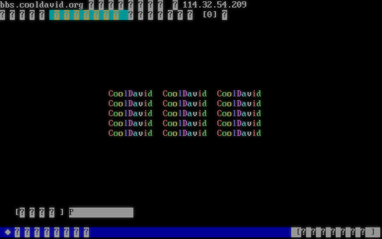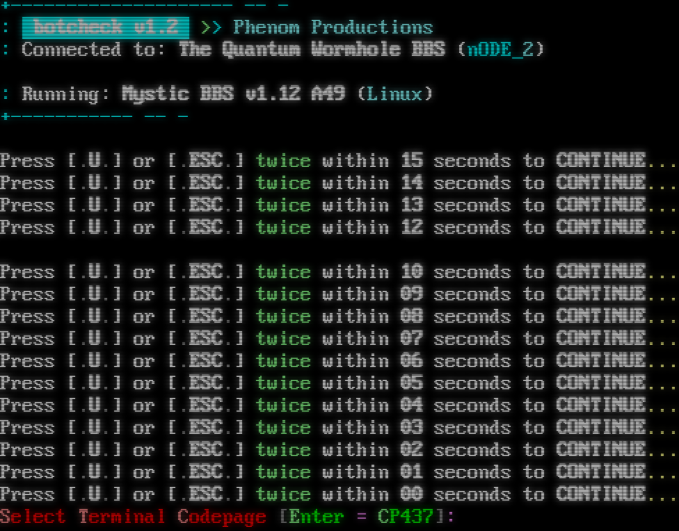 Mystic BBS Version 1.12 A49 Copyright (C) 1997-2023 By James Coyle ╔═════════════════════════════════════════════════════════════════════════════╗ ║ AMIBIOS System Configuration (C) 1985-1991, American Megatrends Inc., ║ ╠═════════════════════════════════════╤═══════════════════════════════════════╣ ║ Main Processor : 80386DX │ Base Memory Size : 640 KB ║ ║ Numeric Processor : │ Ext. Memory Size : 7424 KB ║ ║ Floppy Drive A: : 1.44 MB, 3½" │ Hard Disk C: Type : 47 ║ ║ Floppy Drive B: : 1.2 MB, 5¼" │ Hard Disk D: Type : None ║ ║ Display Type : VGA/PGA/EGA │ Serial Port(s) : 3F8,2F8 ║ ║ AMIBIOS Date : 12/12/91 │ Parallel Port(s) : 378 ║ ╚═════════════════════════════════════╧═══════════════════════════════════════╝ 128KB CACHE MEMORY 40MHz CPU Clock Starting BBS-DOS... HIMEM is testing extended memory...done. This driver is provided by Oak Technology, Inc.. OTI-91X ATAPI CD-ROM device driver, Rev D91XV352 (C)Copyright Oak Technology Inc. 1987-1997 Device Name : MSCD0001 Transfer Mode : Programmed I/O Number of drives : 1 MSCDEX Version 2.23 Copyright (C) Microsoft Corp. 1986-1993. All rights reserved. Drive D: = Driver MSCD0001 unit 0 C:\\>cd\\bbs C:\\BBS>start TQW The Matrix has you... Follow the white rabbit. Knock, Knock, Neo. Detecting terminal emulation: +​-------------------- -- - : botcheck v1.2 >> Phenom Productions : Connected to: The Quantum Wormhole BBS (nODE_2) : Running: Mystic BBS v1.12 A49 (Linux) +​----------- -- - Press [.U.] or [.ESC.] twice within 15 seconds to CONTINUE...Press [.U.] or [.ESC.] twice within 14 seconds to CONTINUE...Press [.U.] or [.ESC.] twice within 13 seconds to CONTINUE...Press [.U.] or [.ESC.] twice within 12 seconds to CONTINUE... Press [.U.] or [.ESC.] twice within 11 seconds to CONTINUE...Press [.U.] or [.ESC.] twice within 10 seconds to CONTINUE...Press [.U.] or [.ESC.] twice within 09 seconds to CONTINUE...Press [.U.] or [.ESC.] twice within 08 seconds to CONTINUE...Press [.U.] or [.ESC.] twice within 07 seconds to CONTINUE...Press [.U.] or [.ESC.] twice within 06 seconds to CONTINUE...Press [.U.] or [.ESC.] twice within 05 seconds to CONTINUE...Press [.U.] or [.ESC.] twice within 04 seconds to CONTINUE...Press [.U.] or [.ESC.] twice within 03 seconds to CONTINUE...Press [.U.] or [.ESC.] twice within 02 seconds to CONTINUE...Press [.U.] or [.ESC.] twice within 01 seconds to CONTINUE...Press [.U.] or [.ESC.] twice within 00 seconds to CONTINUE... [0] CP437 (SyncTerm/NetRunner) [1] UTF-8 (PuTTy/SSH/Telnet) Select Terminal Codepage [Enter = CP437]: