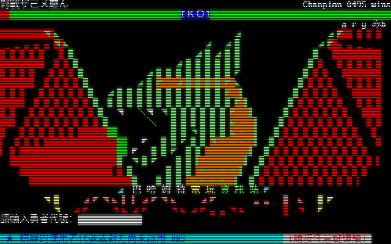 對戰ザ己メ磨ん Champion 0495 wins [KO] дгуみЬ ████◥◣ ◢ ◢◤████ ▁▂▃▄▄◥◣ ◢ ◢█ ◢◤▄▃▂▁ █████ ██ ◢█◢██ █ █████ ████ ██▉ ◢██████ ██ █████ ████ ████ ◢████████◤ ███ ████ ███ █████ ◢█◤ ◢████◤◣ ████ ████ ███ ██████ ◢███████████◤ ▌ █████ ███ ██ ███████ █████████████◤▌ ██████ ███ ██ ████████ ◥ \◥ ◥██████◤- ▌ ███████ ██ █ █████████▄▄▄ \ ██████◣─ ▌ ████████ ██ █ ████████████ ██◥███◣─ ▌ █████████ █ ▌ ███ ████████ ◤ ██◤██◥─── ▌ ██████████ █ ▌████████████ ◤ ██◤ ██ ────▌ ███████████ █████████████ ◥█◤ ██▌────▌ ████████████▌ ██████████████ ███ ────▌ ████████████ ███████████ ███ ███ ──── ▌ ███████████▌ ██████████ ◢ 巴 哈 姆 特 電 玩 資 訊 站 ◤ ◥█ ◢◤◥◣▌▌◢◤◥◣ ◢◤ ▃▃ ▉ ◣ █◤ ◥ ◢◤ ◥◣◢◤ ◥◣◢◤▃▃◥◣ ▉ ◥ ◤ 請輸入勇者代號: ※ 第一次登入請先至 https://user.gamer.com.tw/openBBS.php 啟用 ! ★ 錯誤的使用者代號或對方尚未啟用 BBS [請按任意鍵繼續]