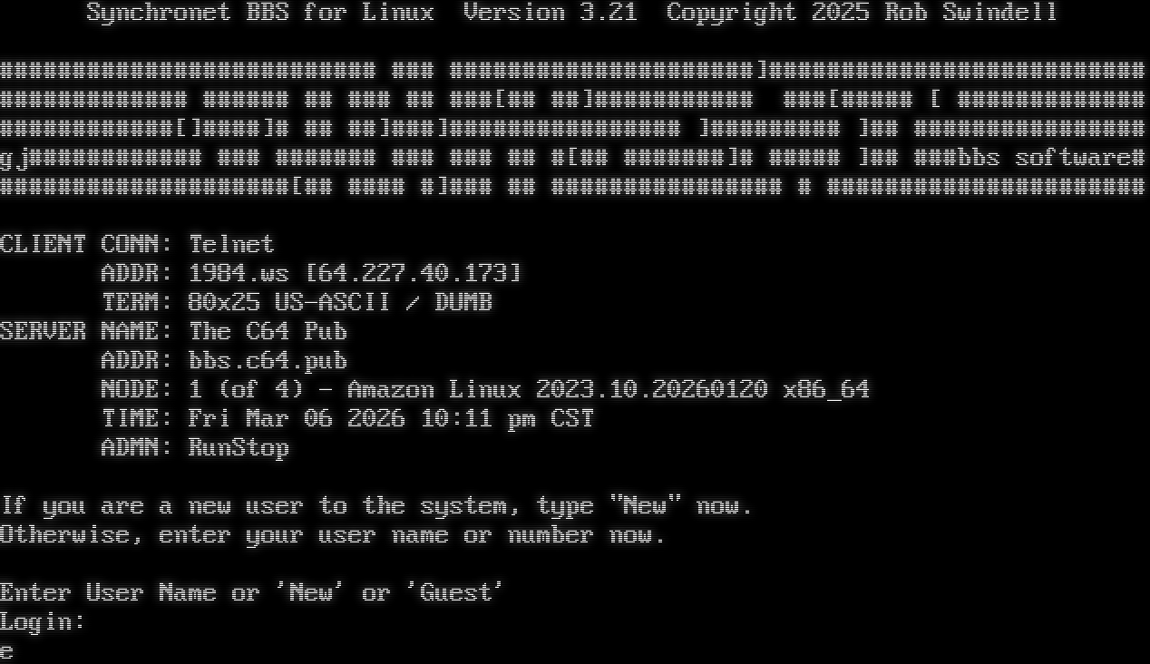 Synchronet BBS for Linux Version 3.21 Telnet connection from: 64.227.40.173 Resolving hostname... _ _ Synchronet BBS for Linux Version 3.21 Copyright 2025 Rob Swindell #​######################### ### #​####################]#​######################### #​############ #​##### ## ### ## ###[## ##]#​########## ###[#​#### [ #​############ #​###########[]#​###]# ## ##]###]#​############### ]#​######## ]## #​############### gj#​########### ### #​###### ### ### ## #[## #​######]# #​#### ]## ###bbs software# #​###################[## #​### #]### ## #​############### # #​##################### CLIENT CONN: Telnet ADDR: 1984.ws [64.227.40.173] TERM: 80x25 US-ASCII / DUMB SERVER NAME: The C64 Pub ADDR: bbs.c64.pub NODE: 1 (of 4) - Amazon Linux 2023.10.20260120 x86_64 TIME: Fri Mar 06 2026 10:11 pm CST ADMN: RunStop If you are a new user to the system, type "New" now. Otherwise, enter your user name or number now. Enter User Name or 'New' or 'Guest' Login: Bee