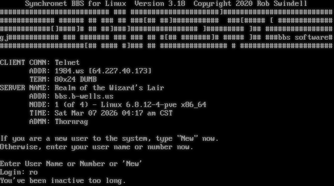 Synchronet BBS for Linux Version 3.18 Telnet connection from: 64.227.40.173 Resolving hostname... _ _ Synchronet BBS for Linux Version 3.18 Copyright 2020 Rob Swindell #​######################### ### #​####################]#​######################### #​############ #​##### ## ### ## ###[## ##]#​########## ###[#​#### [ #​############ #​###########[]#​###]# ## ##]###]#​############### ]#​######## ]## #​############### gj#​########### ### #​###### ### ### ## #[## #​######]# #​#### ]## ###bbs software# #​###################[## #​### #]### ## #​############### # #​##################### CLIENT CONN: Telnet ADDR: 1984.ws [64.227.40.173] TERM: 80x24 DUMB SERVER NAME: Realm of the Wizard's Lair ADDR: bbs.b-wells.us NODE: 1 (of 4) - Linux 6.8.12-4-pve x86_64 TIME: Sat Mar 07 2026 04:17 am CST ADMN: Thornrag If you are a new user to the system, type "New" now. Otherwise, enter your user name or number now. Enter User Name or Number or 'New' Login: ro You've been inactive too long.