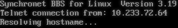 Synchronet BBS for Linux Version 3.19 Telnet connection from: 10.233.72.64 Resolving hostname...