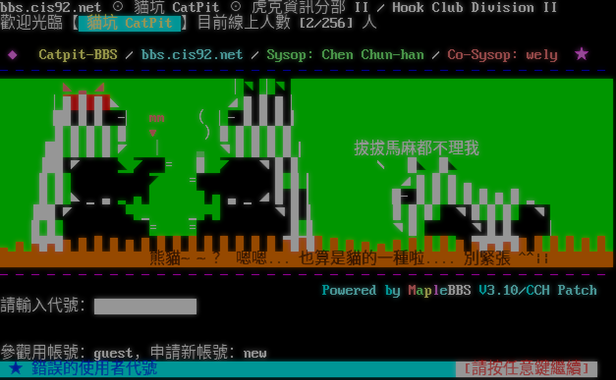 bbs.cis92.net ☉ 貓坑 CatPit ☉ 虎克資訊分部 II / Hook Club Division II 歡迎光臨【 貓坑 CatPit 】目前線上人數 [2/256] 人 ◆ Catpit-BBS / bbs.cis92.net / Sysop: Chen Chun-han / Co-Sysop: wely ★ ─────────────────────────────────────── ◣▂◢ ▕◥▕◥ ▕▇█▇◣ ◢▇█▇▏ ▊███ -▏ mm ( ▕- ███▍ █████ ▼ )█████ ▊████◤ | ▃ ◥████▎ 拔拔馬麻都不理我 ▍█◤ ◣◤ = █ ◤ ◥█▉ \\ ▉◣▉◣ ██ ◤ = ██▎ ◢▇█▇▃ ██◣▁▃▂▄ ▇▅▃▁◢██▎ ▉- █████▆█▂ ▎█◤ ▃▁ ▁▃ █◥█▌ ███ ◥███ ◥ ██ = = █▊ ◥█ ██◥██ ▏ ▂▅▄▄▆▇█▇▆▇████████▆▇█▇▆▅▄▆▇██▆▅▄▅▇███▇█ 熊貓∼∼? 嗯嗯... 也算是貓的一種啦.​... 別緊張 ^^\|\| ─────────────────────────────────────── Powered by MapleBBS V3.10/CCH Patch 請輸入代號: 參觀用帳號:guest,申請新帳號:new ※ 無法連線時,請利用 port 3456 上站 ★ 錯誤的使用者代號 [請按任意鍵繼續]