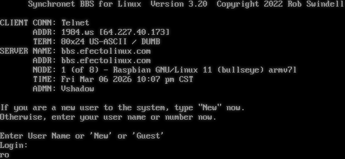 Synchronet BBS for Linux Version 3.20 Telnet connection from: 64.227.40.173 Resolving hostname... _ _ Synchronet BBS for Linux Version 3.20 Copyright 2022 Rob Swindell CLIENT CONN: Telnet ADDR: 1984.ws [64.227.40.173] TERM: 80x24 US-ASCII / DUMB SERVER NAME: bbs.efectolinux.com ADDR: bbs.efectolinux.com NODE: 1 (of 8) - Raspbian GNU/Linux 11 (bullseye) armv7l TIME: Fri Mar 06 2026 10:07 pm CST ADMN: Vshadow If you are a new user to the system, type "New" now. Otherwise, enter your user name or number now. NN: Enter User Name or 'New' or 'Guest' Login: ro