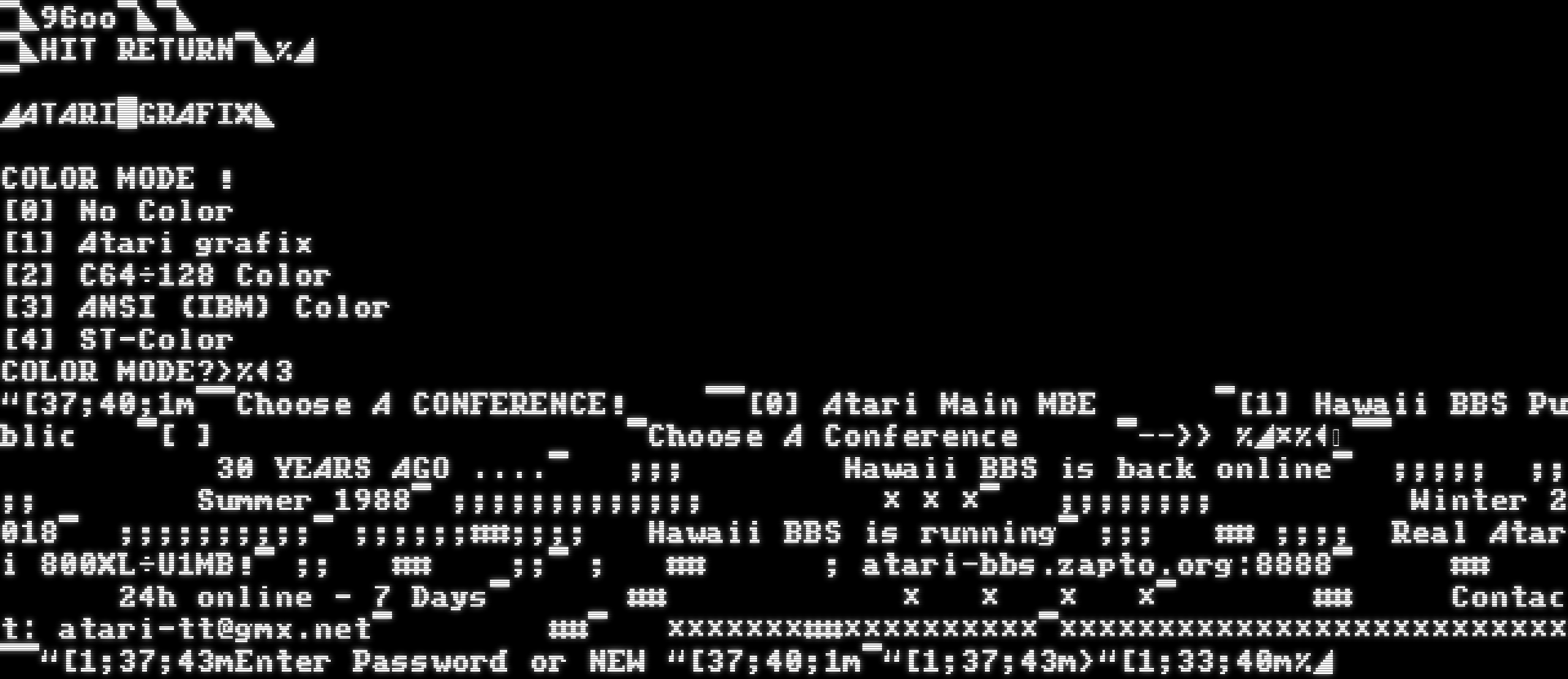 🮂◣96oo🮂◣🮂◣ 🮂◣HIT RETURN🮂◣%◢ 🮂 ◢ATARI█GRAFIX◣ COLOR MODE ! [0] No Color [1] Atari grafix [2] C64/128 Color [3] ANSI (IBM) Color [4] ST-Color COLOR MODE?>%◀3 ␛[37;40;1m🮂🮂Choose A CONFERENCE! 🮂🮂[0] Atari Main MBE 🮂[1] Hawaii BBS Public 🮂[ ] 🮂Choose A Conference 🮂-->> %◢\*%◀↰🮂🮂 30 YEARS AGO .​...🮂 ;;; Hawaii BBS is back online🮂 ;;;;; ;;;; Summer 1988🮂 ;;;;;;;;;;;;; \* \* \*🮂 ;;;;;;;; Winter 2018🮂 ;;;;;;;;;;🮂 ;;;;;;##;;;; Hawaii BBS is running🮂 ;;; ## ;;;; Real Atari 800XL/U1MB!🮂 ;; ## ;;🮂 ; ## ; atari-bbs.zapto.org:8888🮂 ## 24h online - 7 Days🮂 ## \* \* \* \*🮂 ## Contact: atari-tt@gmx.net🮂 ##🮂 \*\*\*\*\*\*\*##\*\*\*\*\*\*\*\*\*\*🮂\*\*\*\*\*\*\*\*\*\*\*\*\*\*\*\*\*\*\*\*\*\*\*\*\*\*🮂🮂␛[1;37;43mEnter Password or NEW ␛[37;40;1m🮂␛[1;37;43m>␛[1;33;40m%◢