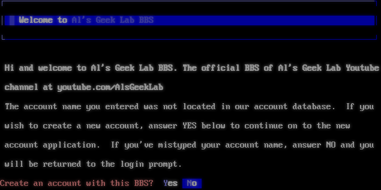 Mystic BBS Version 1.12 A49 Copyright (C) 1997-2024 By James Coyle Detecting terminal emulation: +​-------------------- -- - : botcheck v1.1 >> Phenom Productions : Connected to: Al's Geek Lab (nODE_4) : Running: Mystic BBS v1.12 A49 (Linux) +​----------- -- - Press [.ESC.] twice within 25 seconds to CONTINUE... [0] MS-DOS CP437 [1] UTF-8 Select Terminal Codepage [Enter = CP437]: 1 ▄▄▄ ▄▄▄▀▀▀ █ ▄▄▄▀▀▀ ▄▄▄████▄█ ▄▄▄▀▀▀ ▄▄▄███████████ █ ▄█▀▀ ▄▄▄▄██████████████████ █ ▐█ ▀▌ ██ ▄▄█████████████████████ █ ▀▄ ▐ ▌ █ ▄▀▀ ▄▀██ ███████████████████████▄█ ▄▀ █▀█ █ ▀▀▄ ▄█▄▀███ ████████████████████████ █ ▀ ▀▀ ▀▀ ▀ ▀▀▀ ███ ▄██ ▓██████████████████████▀ █ █▓█ ███░▀██████████████████▀▀▄▄▄▀ ▄▀▀▄ ▐█ █ █▓ ▄██ ▓▄▀▄▀▄▀▄█▀██▀▀▀▀▄▄██▀▀▀ █ ▀ ▄▀▀▄ ▄▀▀▄ █▄▀ █ ▀▀▄ █▀▀▄ ▀▄ ███ ███▀█▀▀▀▀▄▄██▀▀▀ ▄▄ █ ▀█ █▀▀▀ █▀▀▀ █ ▀▄ █ █ ▄▀▀█ █ █ ▀ ▄██ ▀▀▀▄██▀▀▀ ▄▄▀ █ ▀▀ ▀▀ ▀▀ ▀ ▀ ▀▀▀▀ ▀▀ ▀ ▀▀ ▄▄▄ ▀▄██▀▀▀ ▄▄ ▀ ▄▄▀█ ▀ ▄██ █ ▀▄▄▄▄ ▄▄▄▀▄▀▀ ▄▄▀██▀█▄██▀█▄█ BBS ▀▄ ▀▀▄████▄▀▀ ▄▄▀██▀█▄██▀█▄██▀██ ░ ▀▀▄▄▄▄█▀ ▄▄▀██▀█▄██▀█▄███▀▄████ ▓ ▄▄▀██▀█▄██▀█▄██▀▀▄▄████▀▀▄ ▀▄ ▄▀ █▓███▄██▀█▄██▀█▄▄████▀▀▄▄▀▀ ▀▀ ▀█ ▀██▄██▀█▄█████▀▀▄▄▀▀ ▄▄ ▀▄ ▀▄▄█████▀▀▄▄▀▀ ▄▄████ ▄ ▄▀▄▀▄ ▀▄ ▀▀▀▀▄▄▀▀ ▄▄████████ ▄ ▄ ▀▄▀▄███████▄ ▀▄▄▀▀ ▄▄████████▀█▀▄ [■] Enter your user name: ┌─────────────────────────────────────────────────────────────────────────────┐ │ ▒ Welcome to Al's Geek Lab BBS │ └─────────────────────────────────────────────────────────────────────────────┘ Hi and welcome to Al's Geek Lab BBS. The official BBS of Al's Geek Lab Youtube channel at youtube.com/AlsGeekLab The account name you entered was not located in our account database. If you wish to create a new account, answer YES below to continue on to the new account application. If you've mistyped your account name, answer NO and you will be returned to the login prompt. Create an account with this BBS? Yes No