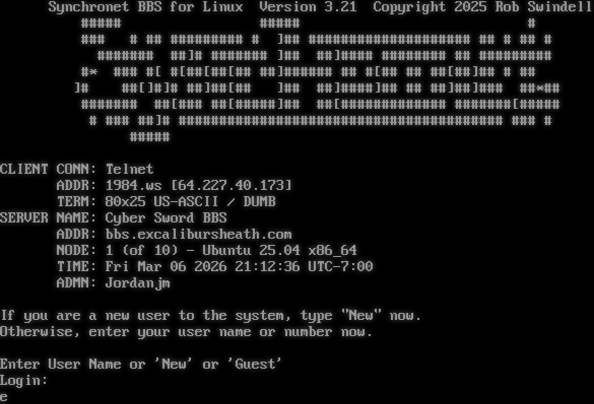 Synchronet BBS for Linux Version 3.21 Telnet connection from: 64.227.40.173 Resolving hostname... _ _ Synchronet BBS for Linux Version 3.21 Copyright 2025 Rob Swindell #​#### #​#### # ### # ## #​######## # ]## #​################### ## # ## # #​###### ##]# #​###### ]## ##]#​### #​####### ## #​######## #\* ### #[ #[##[##[## ##]#​##### ## #[## ## ##[##]## # ## ]# ##[]#]# ##]##[## ]## ##]#​###]## ## ##]##]### ##\*## #​###### ##[### ##[#​####]## ##[#​############ #​######[#​#### # ### ##]# #​####################################### ### # #​#### CLIENT CONN: Telnet ADDR: 1984.ws [64.227.40.173] TERM: 80x25 US-ASCII / DUMB SERVER NAME: Cyber Sword BBS ADDR: bbs.excalibursheath.com NODE: 1 (of 10) - Ubuntu 25.04 x86_64 TIME: Fri Mar 06 2026 21:12:36 UTC-7:00 ADMN: Jordanjm If you are a new user to the system, type "New" now. Otherwise, enter your user name or number now. Enter User Name or 'New' or 'Guest' Login: Bee