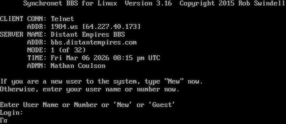 Synchronet BBS for Linux Version 3.16 Connection from: 64.227.40.173 Resolving hostname... _┬ƒZuul.connection.write('\\x1bAre you the gatekeeper?')┬£_ Synchronet BBS for Linux Version 3.16 Copyright 2015 Rob Swindell CLIENT >>>>CONN: Telnet >>>>ADDR: 1984.ws [64.227.40.173] SERVER >>>>NAME: Distant Empires BBS >>>>ADDR: bbs.distantempires.com >>>>NODE: 1 (of 32) >>>>TIME: Fri Mar 06 2026 08:15 pm UTC >>>>ADMN: Nathan Coulson If you are a new user to the system, type "New" now. Otherwise, enter your user name or number now. Enter User Name or Number or 'New' or 'Guest' NN:Login: Γσ