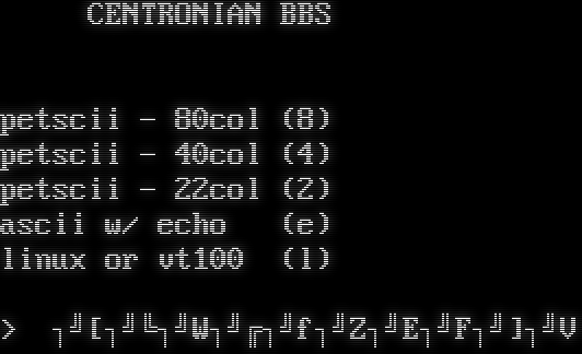 CENTRONIAN BBS petscii - 80col (8) petscii - 40col (4) petscii - 22col (2) ascii w/ echo (e) linux or vt100 (l) > ┐╝[┐╝╚┐╝W┐╝╔┐╝f┐╝Z┐╝E┐╝F┐╝]┐╝V