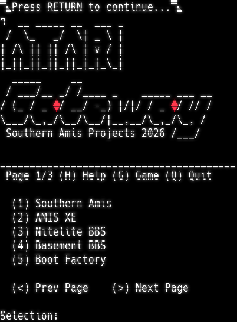🮂◣Press RETURN to continue...🮂◣ ↰ __ _​____ __ ___ _ / \\_ _/ \\\| _ \\ \| \| /\\ \|\| \|\| /\\ \| v / \| \|_\|\|_\|\|_\|\|_\|\|_\|_\|_\\_\| _​____ __ / ___/__ _/ /_​___ _ _​____ ___ __ / (_ / _ ♦/ __/ -_) \|/\|/ / _ ♦/ // / \\___/\\_,_/\\__/\\__/\|__,__/\\_,_/\\_, / Southern Amis Projects 2026 /___/ _​_______________________________________ Page 1/3 (H) Help (G) Game (Q) Quit (1) Southern Amis (2) AMIS XE (3) Nitelite BBS (4) Basement BBS (5) Boot Factory (<) Prev Page (>) Next Page Selection: