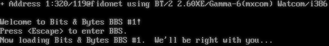 \*\*EMSI_REQA77E \*\*EMSI_REQA77E + Address 1:320/119@fidonet using BT/2 2.60XE/Gamma-6(mxcom) Watcom/i386 Welcome to Bits & Bytes BBS #1! \*\*EMSI_REQA77E Press <Escape> to enter BBS. Now loading Bits & Bytes BBS #1. We'll be right with you...