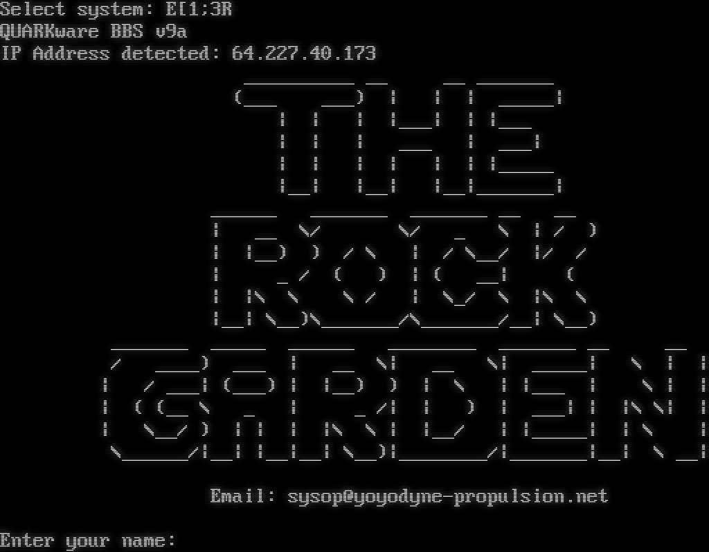 ┬á ANSI not Detected Welcome to The Switchbaud (300/1200/2400) Please select the system to connect to: (Note: You are selecting a theme, they are really all the same system.) 1...Tardis BBS (QBBS) 2...Nostromo BBS (WBBS) 3...The Rock Garden BBS (MajorBBS) Select system: E[1;3R Spam, Spam, Bacon, Spam... QUARKware BBS v9a IP Address detected: 64.227.40.173 _​_________ __ __ _​______ (___ ___) \| \| \| _​____\| \| \| \| \|___\| \| \|___ \| \| \| ___ \| ___\| \| \| \| \| \| \| \|_​____ \|__\| \|__\| \|__\|_​______\| _​_____ _​______ _​______ __ __ \| __ \\/ \\/ _ \\ \| / ) \| \|__) ) / \\ \| / \\__/ \|/ / \| _ / ( ) \| ( __\| ( \| \|\\ \\ \\ / \| \\_/ \\ \|\\ \\ \|__\| \\__)\\_​______/\\_​______/__\| \\__) _​______ _​____ _​_____ _​_______ _​______ __ __ / _​___) ___ \| __ \\\| __ \\\| _​____\| \\ \| \| \| / ___\| (___) \| \|__) ) \| \\ \| \|___ \| \\ \| \| \| ( (__ \\ _ \| _ /\| \| ) \| ___\| \| \|\\ \\\| \| \| \\__/ ) \| \| \| \|\\ \\ \| \|__/ \| \|_​____\| \| \\ \| \\_​_____/\|__\| \|__\|__\| \\__)\|_​_______/\|_​______\|__\| \\ __\| Email: sysop@yoyodyne-propulsion.net Enter your name: