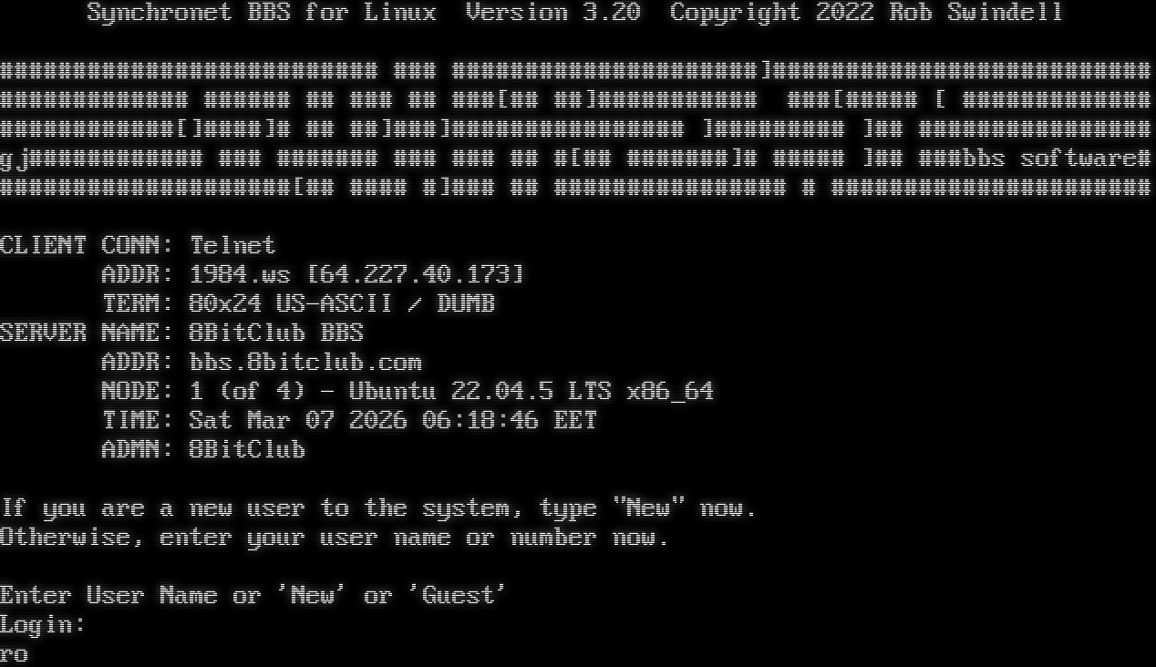 Synchronet BBS for Linux Version 3.20 Telnet connection from: 64.227.40.173 Resolving hostname... _ _ Synchronet BBS for Linux Version 3.20 Copyright 2022 Rob Swindell #​######################### ### #​####################]#​######################### #​############ #​##### ## ### ## ###[## ##]#​########## ###[#​#### [ #​############ #​###########[]#​###]# ## ##]###]#​############### ]#​######## ]## #​############### gj#​########### ### #​###### ### ### ## #[## #​######]# #​#### ]## ###bbs software# #​###################[## #​### #]### ## #​############### # #​##################### CLIENT CONN: Telnet ADDR: 1984.ws [64.227.40.173] TERM: 80x24 US-ASCII / DUMB SERVER NAME: 8BitClub BBS ADDR: bbs.8bitclub.com NODE: 1 (of 4) - Ubuntu 22.04.5 LTS x86_64 TIME: Sat Mar 07 2026 06:18:46 EET ADMN: 8BitClub If you are a new user to the system, type "New" now. Otherwise, enter your user name or number now. NN: Enter User Name or 'New' or 'Guest' Login: ro