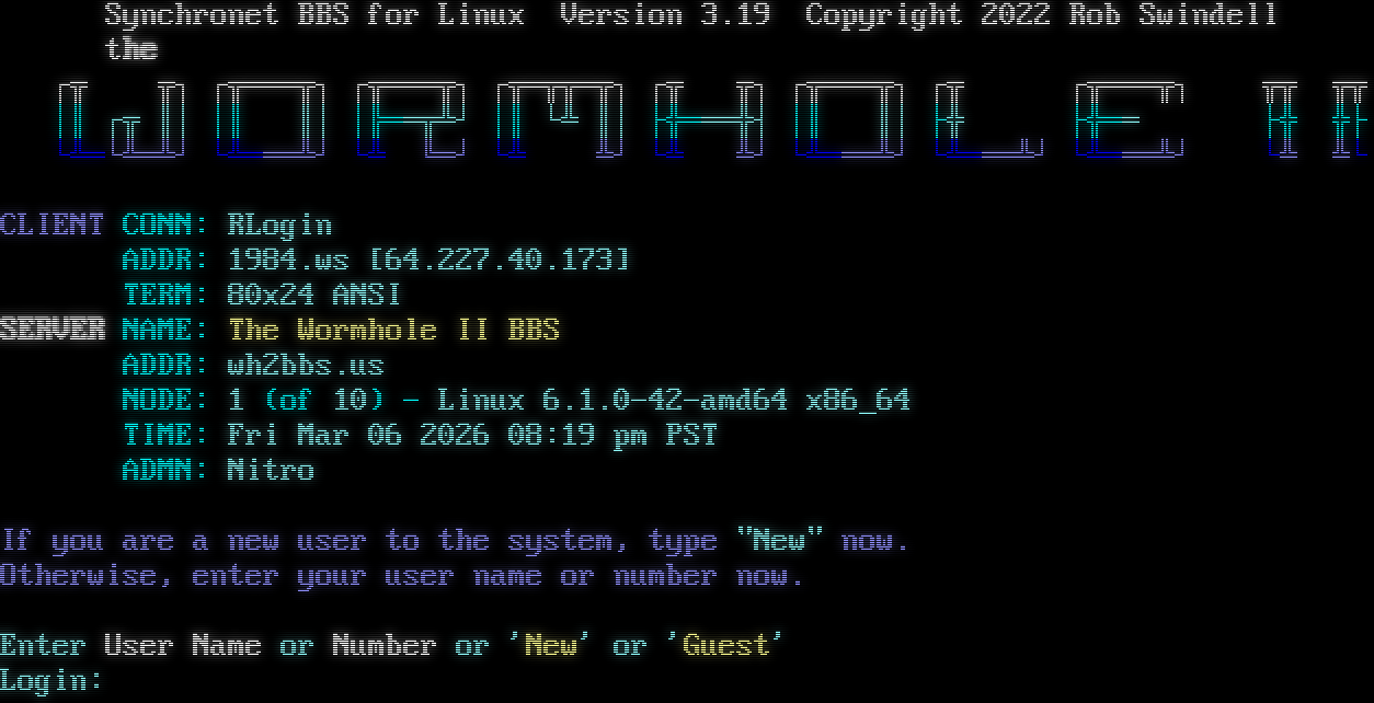Synchronet BBS for Linux Version 3.19 RLogin connection from: 64.227.40.173 Resolving hostname... _ _ Synchronet BBS for Linux Version 3.19 Copyright 2022 Rob Swindell the ┌╦ ╦┐ ┌╦═══╦┐ ┌╦═══╦┐ ┌╦═╦╦═╦┐ ┌╦ ╦┐ ┌╦═══╦┐ ┌╦ ┌╦═══╦┐ ╦╦ ╦╦ │║ ┌╦ ║│ │║ ║│ │╠══╦╩┘ │║ └╩ ║│ ├╬═══╬┤ │║ ║│ ├╬ ├╬══├╬ ╬├ └╩═└╩═╩┘ └╩═══╩┘ └╩ ╚═┘ └╩ ╩┘ └╩ ╩┘ └╩═══╩┘ └╩═══╩┘ └╩═══╩┘ └╩ ╩└ CLIENT CONN: RLogin ADDR: 1984.ws [64.227.40.173] TERM: 80x24 ANSI SERVER NAME: The Wormhole II BBS ADDR: wh2bbs.us NODE: 1 (of 10) - Linux 6.1.0-42-amd64 x86_64 TIME: Fri Mar 06 2026 08:19 pm PST ADMN: Nitro If you are a new user to the system, type "New" now. Otherwise, enter your user name or number now. Enter User Name or Number or 'New' or 'Guest' Login: