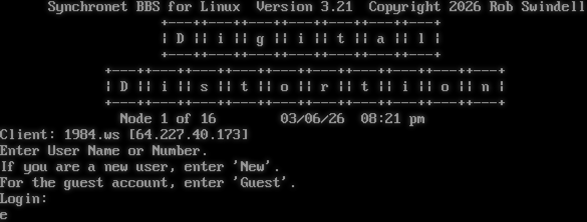 Synchronet BBS for Linux Version 3.21 Telnet connection from: 64.227.40.173 Resolving hostname... _ ∩╗┐ Synchronet BBS for Linux Version 3.21 Copyright 2026 Rob Swindell +​---++---++---++---++---++---++---+ \| D \|\| i \|\| g \|\| i \|\| t \|\| a \|\| l \| +​---++---++---++---++---++---++---+ +​---++---++---++---++---++---++---++---++---++---+ \| D \|\| i \|\| s \|\| t \|\| o \|\| r \|\| t \|\| i \|\| o \|\| n \| +​---++---++---++---++---++---++---++---++---++---+ Node 1 of 16 03/06/26 08:21 pm Client: 1984.ws [64.227.40.173] Enter User Name or Number. If you are a new user, enter 'New'. For the guest account, enter 'Guest'. Login: Bee