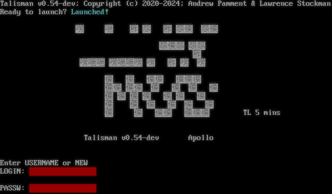 Talisman v0.54-dev; Copyright (c) 2020-2024; Andrew Pamment & Lawrence Stockman Ready to launch? Launched! 嗙嗈葄葾葄葾葔葾葔 葾葔葾葾葾 葄 嗙嗈嗈嗙嗈嗈嗙嗙葄嗙嗙 葔葔葔葔葔葔葔 葔葔葔葔葔葔葔葔 葔葔葔葔葔葔葔 葔葔葔葔葔葔 葔葔葔葔葔葔葔TL 5 mins Talisman v0.54-dev Apollo Enter USERNAME or NEW LOGIN: PASSW: