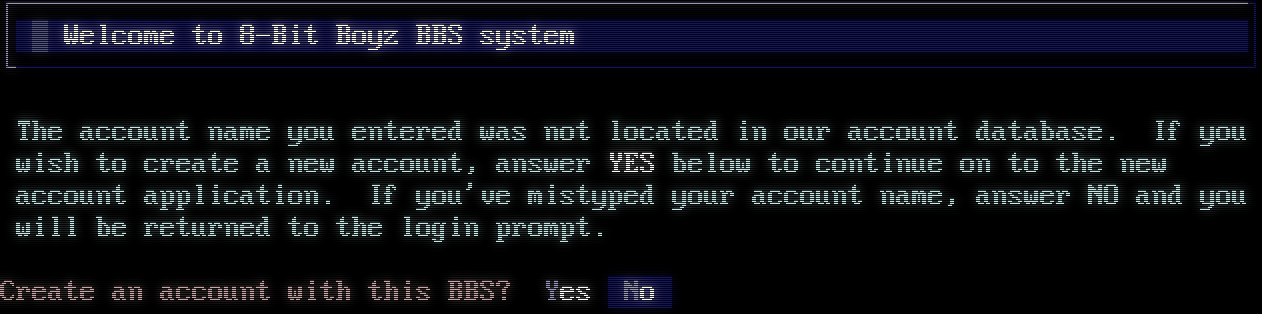 Mystic BBS Version 1.12 A48 Copyright (C) 1997-2023 By James Coyle Detecting terminal emulation: ANSI detected. ▐▀▀▀▀▀▀▀▀▀▀▀▀▀▀▀▀▀▀▀▀▀▀▀▀▀▀▀▀▀▀▀▀▀▀▌ ▐ ▀▀▀▀▀▀▀▀▀▀▀▀▀▀▀▀ ▌ ▐ 8-Bit Boyz BBS ▌ Welcome To: ▐ SysOp - PalKat ▐ 8-Bit Boyz BBS! ▐ ▄▄▄▄▄▄▄▄▄▄▄▄▄▄▄▄ █ ▌ ▐ █▄▄▄▄▄█ ▌ ▐ ▄▀▀▄ ▌ Telnet: bbs.8bitboyz.com:6502 ▐ █ █ ▌ ▐ █ ███████ █ ▌ Webite: www.8bitboyz.com ▐ ▀▄ ▄▀ ▄ ▌ ▐ ▀▄▄▄▄▄▀ ▌ CommodoreNet 64:500/23, ▐ █ ▌ FidoNet 1:305/3, fsxNet 21:4/137 ▐ ▀ ▀ ▌RetroNet 80:505/6 ▐ ▌ ▐ ▌Also check out our ▐ ▄ ▄ ▌Image BBS "The Kats Alley" ▐▄▄▄▄▄▄▄▄▄▄▄▄▄▄▄▄▄▄▄▄▄▄▄▄▄▄▄▄▄▄▄▄▄▄▌Telnet: tka.8bitboyz.com:6400 -=[ Classic INFOCOM text adventures available in our games section! ]=- [■] Enter your user name: ┌─────────────────────────────────────────────────────────────────────────────┐ │ ▒ Welcome to 8-Bit Boyz BBS system │ └─────────────────────────────────────────────────────────────────────────────┘ The account name you entered was not located in our account database. If you wish to create a new account, answer YES below to continue on to the new account application. If you've mistyped your account name, answer NO and you will be returned to the login prompt. Create an account with this BBS? Yes No
