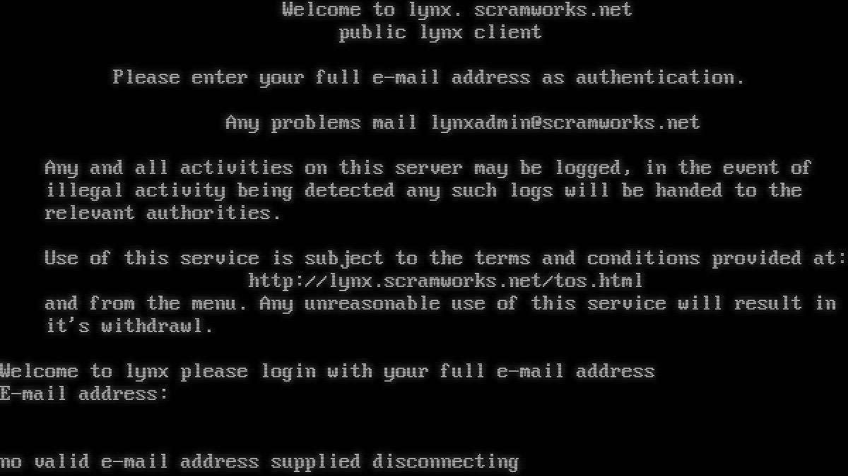 Welcome to lynx. scramworks.net public lynx client Please enter your full e-mail address as authentication. Any problems mail lynxadmin@scramworks.net Any and all activities on this server may be logged, in the event of illegal activity being detected any such logs will be handed to the relevant authorities. Use of this service is subject to the terms and conditions provided at: http://lynx.scramworks.net/tos.html and from the menu. Any unreasonable use of this service will result in it's withdrawl. Welcome to lynx please login with your full e-mail address E-mail address: no valid e-mail address supplied disconnecting