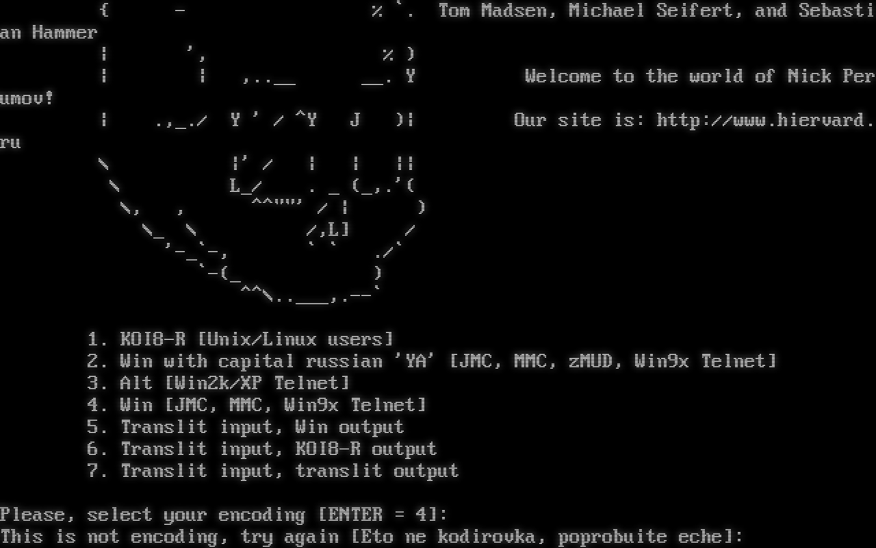_ _ _ _ \| \| \| (_) ___ _ _​___ _​___ _ _ __ __\| \| \| \|_\| \| \|/ _ \\ '__\\ \\ / / _\` \| '__/ _\` \| \| _ \| \| __/ \| \\ V / (_\| \| \| \| (_\| \| \|_\| \|_\|_\|\\___\|_\| \\_/ \\__,_\|_\| \\__,_\| ,--. __ __ _ _ _​___ { } \| \\/ \| \| \| \| _ \\ K, } \| \|\\/\| \| \| \| \| \| \| \| / \`Y\` \| \| \| \| \|_\| \| \|_\| \| _ / / \|_\| \|_\|\\___/\|_​___/ {_'-K.__/ \`/-​.__L._ / ' /\`\\_} / ' / _​___ / ' / Based on CircleMUD 3.1, ,-'~​~~~ ~~/ ' /_ Created by Jeremy Elson ,' \`\`~~~%', ( % Y A derivative of DikuMUD (GAMMA 0.0), { % I created by Hans-Henrik Staerfeldt, Katja Nyboe, { - % \`. Tom Madsen, Michael Seifert, and Sebastian Hammer \| ', % ) \| \| ,.​.__ __. Y Welcome to the world of Nick Perumov! \| .,_./ Y ' / ^Y J )\| Our site is: http://www.hiervard.ru \\ \|' / \| \| \|\| \\ L_/ . _ (_,.'( \\, , ^​^""' / \| ) \\_ \\ /,L] / '-_\`-, \` \` ./\` \`-(_ ) ^^\\.​.___,.--\` 1. KOI8-R [Unix/Linux users] 2. Win with capital russian 'YA' [JMC, MMC, zMUD, Win9x Telnet] 3. Alt [Win2k/XP Telnet] 4. Win [JMC, MMC, Win9x Telnet] 5. Translit input, Win output 6. Translit input, KOI8-R output 7. Translit input, translit output Please, select your encoding [ENTER = 4]: This is not encoding, try again [Eto ne kodirovka, poprobuite eche]:
