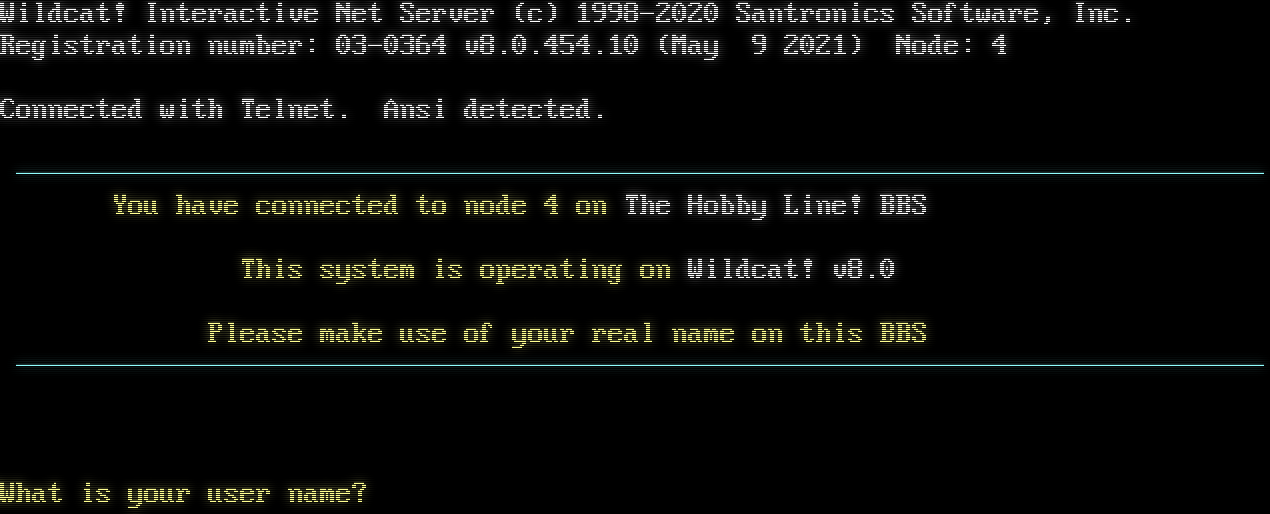 =​=========================================================================== Your IP Address 64.227.40.173: is being Logged for Security Purposes... =​=========================================================================== <WC145403-0364174321E7C11481294823> Wildcat! Interactive Net Server (c) 1998-2020 Santronics Software, Inc. Registration number: 03-0364 v8.0.454.10 (May 9 2021) Node: 4 Connected with Telnet. Ansi detected. ────────────────────────────────────────────────────────────────────────────── You have connected to node 4 on The Hobby Line! BBS This system is operating on Wildcat! v8.0 Please make use of your real name on this BBS ────────────────────────────────────────────────────────────────────────────── What is your user name?