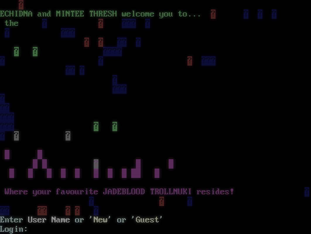 Synchronet BBS for Linux Version 3.20 Telnet connection from: 64.227.40.173 Resolving hostname... _ _ Synchronet BBS for Linux Version 3.20 Copyright 2025 Rob Swindell ۲ ECHIDNA and MINTEE THRESH welcome you to... ۲ ۱ ۲ ۲ the ۲ ۰ ۲۰۲ ۲ ۰ ۲۲۲ ۰ ۲ ۱۰ ۰ ۰ ۰ ۱۱۲۰ ۲ ۰ ۱ ۲۲۲ ۱۰ ۰ ۲ ߰ ۰۲۱ ۲ ۰۲ ۲۲۰ ۱۰۲ ۰ ۰ ۱ ۲ ۲ ܲ ߲ ߱ Where your favourite JADEBLOOD TROLLNUKI resides! ۱ ۱ ۲ ۰ ۱۰ ۱۱ ۱ ۱ ۲ NN: Enter User Name or 'New' or 'Guest' Login: