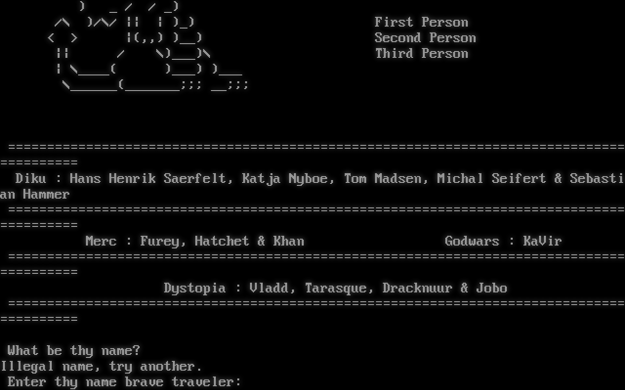 This mud is based of the stock Dystopia 1.2 code, a godwars deriviative á \\=/, \| @___oo /\\ /\\ / (___,,,} ) /^\\) ^\\/ _) ) /^\\/ _) Your Mud Name By ) _ / / _) /\\ )/\\/ \|\| \| )_) First Person < > \|(,,) )__) Second Person \|\| / \\)___)\\ Third Person \| \\_​___( )___) )___ \\_​_____(_​______;;; __;;; =​======================================================================================== Diku : Hans Henrik Saerfelt, Katja Nyboe, Tom Madsen, Michal Seifert & Sebastian Hammer =​======================================================================================== Merc : Furey, Hatchet & Khan Godwars : KaVir =​======================================================================================== Dystopia : Vladd, Tarasque, Dracknuur & Jobo =​======================================================================================== What be thy name? Illegal name, try another. Enter thy name brave traveler: