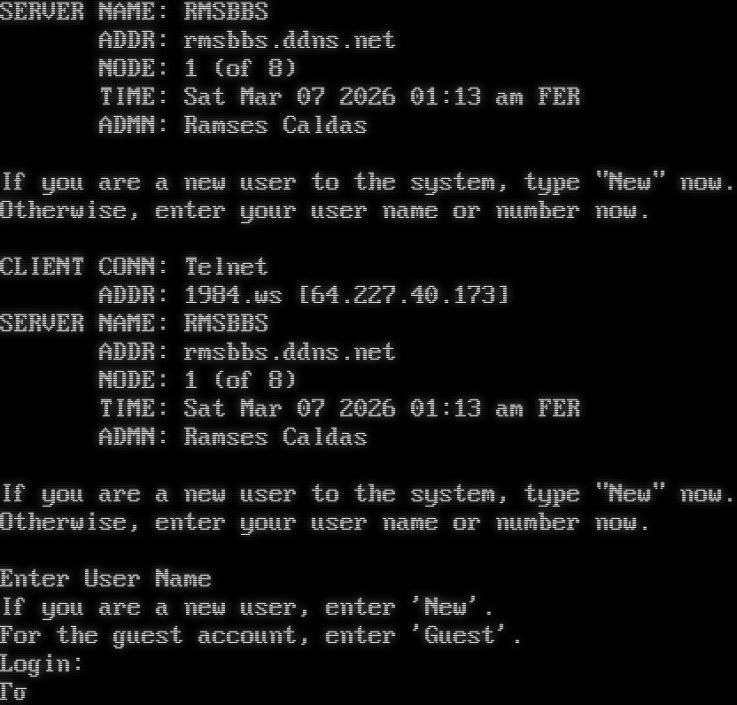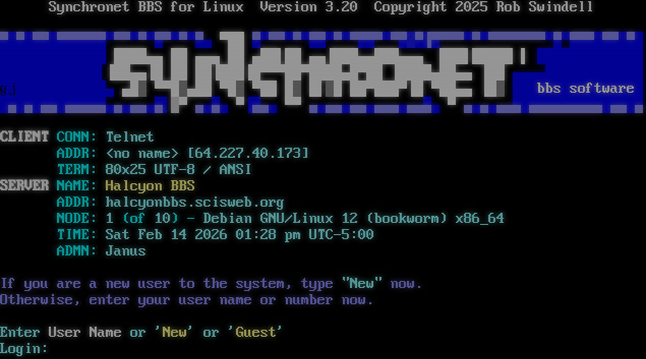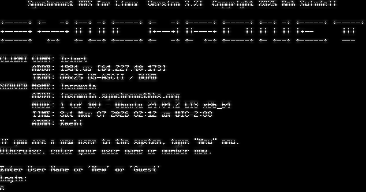 Synchronet BBS for Linux Version 3.21 Telnet connection from: 64.227.40.173 Resolving hostname... _ _ Synchronet BBS for Linux Version 3.21 Copyright 2025 Rob Swindell +​-----+ +- -+ +​--+ -+ +​-----+ +- -+ +​-----+ +​-----+ +​--+ -+ +​-----+ +​-----+ +​-----+ +​-----+ \|\| \| \|\| \|\| \|+​---+\| \|\|-​---+ \|\| \|\| \|\| \| \|\| \|+-- \|\|\| +​-----+ +-+ +- +​--+ +​-----+ +- -+ +- +-+ +​-----+ +- +​--+ +​-----+ --- CLIENT CONN: Telnet ADDR: 1984.ws [64.227.40.173] TERM: 80x25 US-ASCII / DUMB SERVER NAME: Insomnia ADDR: insomnia.synchronetbbs.org NODE: 1 (of 10) - Ubuntu 24.04.2 LTS x86_64 TIME: Sat Mar 07 2026 02:12 am UTC-2:00 ADMN: Kaehl If you are a new user to the system, type "New" now. Otherwise, enter your user name or number now. NN: Enter User Name or 'New' or 'Guest' Login: Bee