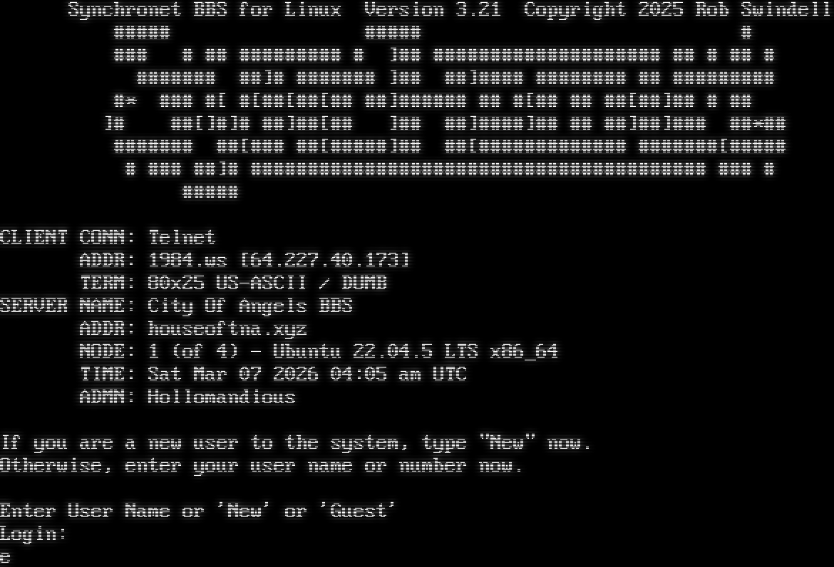 Synchronet BBS for Linux Version 3.21 Telnet connection from: 64.227.40.173 Resolving hostname... _  Synchronet BBS for Linux Version 3.21 Copyright 2025 Rob Swindell #​#### #​#### # ### # ## #​######## # ]## #​################### ## # ## # #​###### ##]# #​###### ]## ##]#​### #​####### ## #​######## #\* ### #[ #[##[##[## ##]#​##### ## #[## ## ##[##]## # ## ]# ##[]#]# ##]##[## ]## ##]#​###]## ## ##]##]### ##\*## #​###### ##[### ##[#​####]## ##[#​############ #​######[#​#### # ### ##]# #​####################################### ### # #​#### CLIENT CONN: Telnet ADDR: 1984.ws [64.227.40.173] TERM: 80x25 US-ASCII / DUMB SERVER NAME: City Of Angels BBS ADDR: houseoftna.xyz NODE: 1 (of 4) - Ubuntu 22.04.5 LTS x86_64 TIME: Sat Mar 07 2026 04:05 am UTC ADMN: Hollomandious If you are a new user to the system, type "New" now. Otherwise, enter your user name or number now. Enter User Name or 'New' or 'Guest' Login: Bee