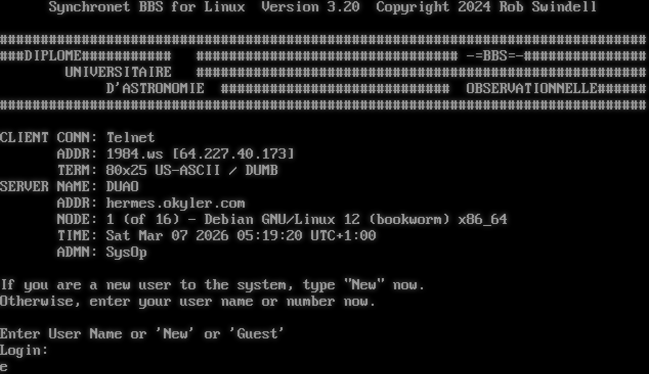 Synchronet BBS for Linux Version 3.20 Telnet connection from: 64.227.40.173 Resolving hostname... _ _ Synchronet BBS for Linux Version 3.20 Copyright 2024 Rob Swindell #​############################################################################## ###DIPLOME#​########## #​############################### -=BBS=​-############### UNIVERSITAIRE #​###################################################### D'ASTRONOMIE #​########################### OBSERVATIONNELLE#​##### #​############################################################################## CLIENT CONN: Telnet ADDR: 1984.ws [64.227.40.173] TERM: 80x25 US-ASCII / DUMB SERVER NAME: DUAO ADDR: hermes.okyler.com NODE: 1 (of 16) - Debian GNU/Linux 12 (bookworm) x86_64 TIME: Sat Mar 07 2026 05:19:20 UTC+1:00 ADMN: SysOp If you are a new user to the system, type "New" now. Otherwise, enter your user name or number now. NN: Enter User Name or 'New' or 'Guest' Login: Bee