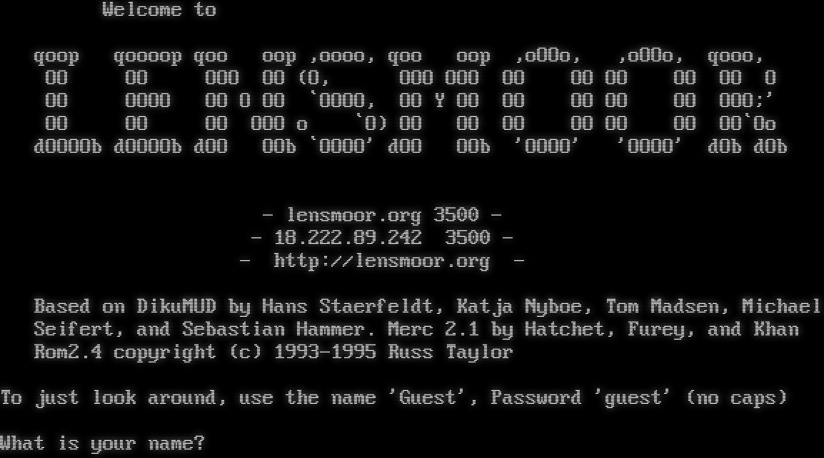 Welcome to qoop qoooop qoo oop ,oooo, qoo oop ,oOOo, ,oOOo, qooo, OO OO OOO OO (O, OOO OOO OO OO OO OO OO O OO OOOO OO O OO \`OOOO, OO Y OO OO OO OO OO OOO;' OO OO OO OOO o \`O) OO OO OO OO OO OO OO\`Oo dOOOOb dOOOOb dOO OOb \`OOOO' dOO OOb 'OOOO' 'OOOO' dOb dOb - lensmoor.org 3500 - - 18.222.89.242 3500 - - http://lensmoor.org - Based on DikuMUD by Hans Staerfeldt, Katja Nyboe, Tom Madsen, Michael Seifert, and Sebastian Hammer. Merc 2.1 by Hatchet, Furey, and Khan Rom2.4 copyright (c) 1993-1995 Russ Taylor To just look around, use the name 'Guest', Password 'guest' (no caps) What is your name?