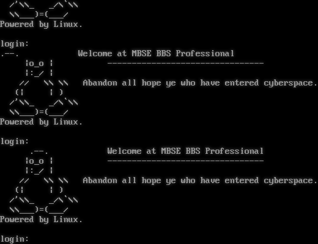 Linux 6.1.0-37-amd64 (mbsedev.lan) (pts/0) .​--. Welcome at MBSE BBS Professional \|o_o \| -​------------------------------- \|:_/ \| // \\\\ \\\\ Abandon all hope ye who have entered cyberspace. (\| \| ) /'\\\\_ _/\\\`\\\\ \\\\___)=(___/ Powered by Linux. login: .​--. Welcome at MBSE BBS Professional \|o_o \| -​------------------------------- \|:_/ \| // \\\\ \\\\ Abandon all hope ye who have entered cyberspace. (\| \| ) /'\\\\_ _/\\\`\\\\ \\\\___)=(___/ Powered by Linux. login: .​--. Welcome at MBSE BBS Professional \|o_o \| -​------------------------------- \|:_/ \| // \\\\ \\\\ Abandon all hope ye who have entered cyberspace. (\| \| ) /'\\\\_ _/\\\`\\\\ \\\\___)=(___/ Powered by Linux. login: