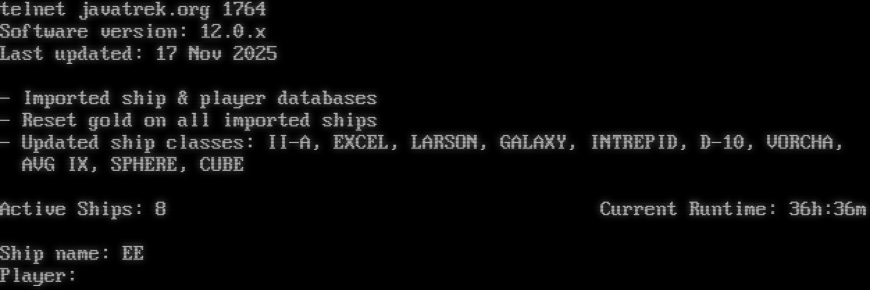 telnet javatrek.org 1764 Software version: 12.0.x Last updated: 17 Nov 2025 - Imported ship & player databases - Reset gold on all imported ships - Updated ship classes: II-A, EXCEL, LARSON, GALAXY, INTREPID, D-10, VORCHA, AVG IX, SPHERE, CUBE Active Ships: 8 Current Runtime: 36h:36m Ship name: EE Player: