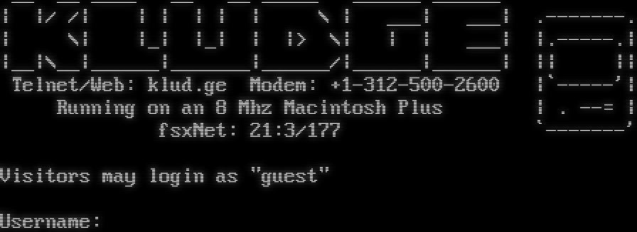 __ __ _​___ __ __ _​____ _​_____ _​_____ \| \|/ /\| \| \| \| \| \| \\ \| ___\| ___\| .​-------. \| \\\| \|_\| \|_\| \| \|> \\\| \| \| ___\| \|.​-----.\| \|__\|\\__\|_​_____\|_​______\|_​_____/\|_​_____\|_​_____\| \|\| \|\| Telnet/Web: klud.ge Modem: +1-312-500-2600 \|\`-​----'\| Running on an 8 Mhz Macintosh Plus \| . --= \| fsxNet: 21:3/177 \`-​------' Visitors may login as "guest" Username:
