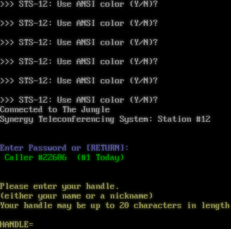 >>> STS-12: Use ANSI color (Y/N)? >>> STS-12: Use ANSI color (Y/N)? >>> STS-12: Use ANSI color (Y/N)? >>> STS-12: Use ANSI color (Y/N)? >>> STS-12: Use ANSI color (Y/N)? >>> STS-12: Use ANSI color (Y/N)? >>> STS-12: Use ANSI color (Y/N)? >>> STS-12: Use ANSI color (Y/N)? Connected to The Jungle Synergy Teleconferencing System: Station #12 Enter Password or [RETURN]: Caller #22686 (#1 Today) Please enter your handle. (either your name or a nickname) Your handle may be up to 20 characters in length HANDLE=
