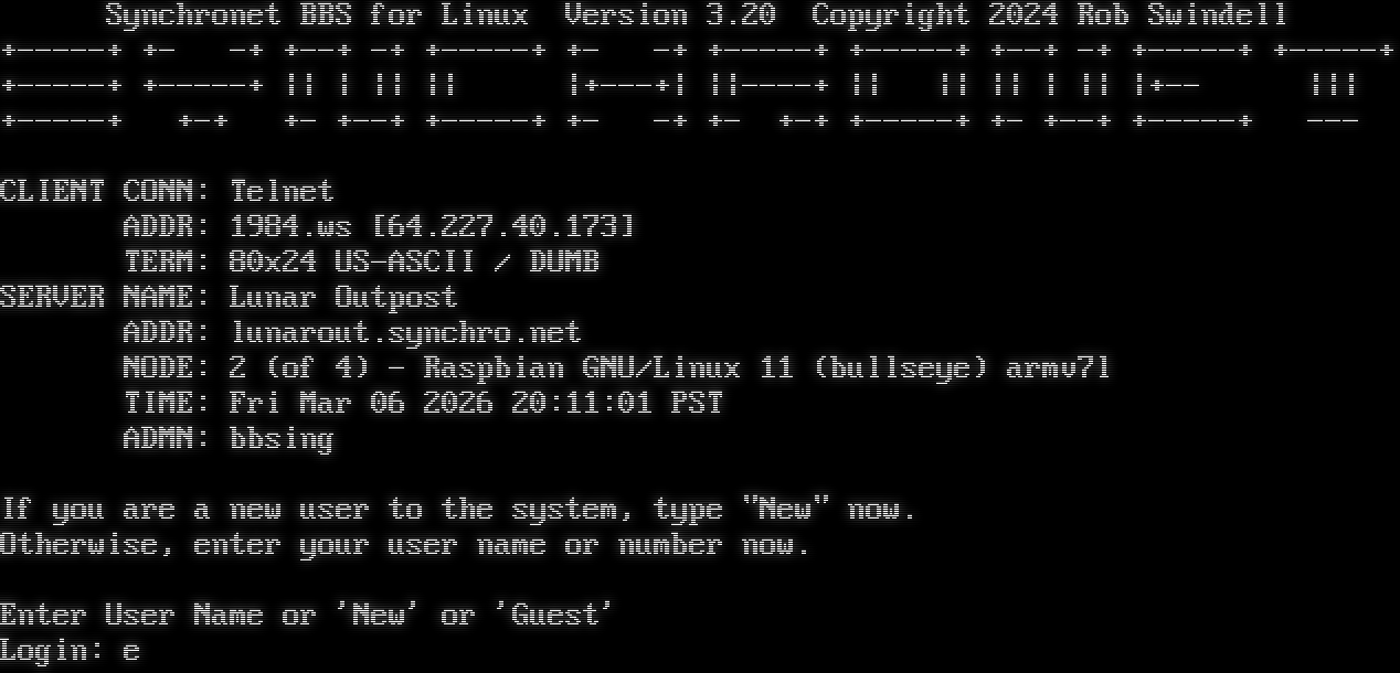 Synchronet BBS for Linux Version 3.20 Telnet connection from: 64.227.40.173 Resolving hostname... _ ∩╗┐_ Synchronet BBS for Linux Version 3.20 Copyright 2024 Rob Swindell +​-----+ +- -+ +​--+ -+ +​-----+ +- -+ +​-----+ +​-----+ +​--+ -+ +​-----+ +​-----+ +​-----+ +​-----+ \|\| \| \|\| \|\| \|+​---+\| \|\|-​---+ \|\| \|\| \|\| \| \|\| \|+-- \|\|\| +​-----+ +-+ +- +​--+ +​-----+ +- -+ +- +-+ +​-----+ +- +​--+ +​-----+ --- CLIENT CONN: Telnet ADDR: 1984.ws [64.227.40.173] TERM: 80x24 US-ASCII / DUMB SERVER NAME: Lunar Outpost ADDR: lunarout.synchro.net NODE: 2 (of 4) - Raspbian GNU/Linux 11 (bullseye) armv7l TIME: Fri Mar 06 2026 20:11:01 PST ADMN: bbsing If you are a new user to the system, type "New" now. Otherwise, enter your user name or number now. NN: Enter User Name or 'New' or 'Guest' Login: Bee
