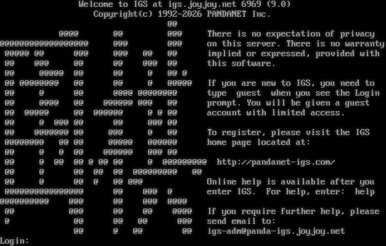 Welcome to IGS at igs.joyjoy.net 6969 (9.0) Copyright(c) 1992-2026 PANDANET Inc. @@ @@@@ @@ @@@ There is no expectation of privacy @@@@@@@@@@@@@@@@@@ @@@ @@@ on this server. There is no warranty @@@@@ @@ @@@ @@@ @@ @@ implied or expressed, provided with @@ @@@ @@ @@ @@@ @@ this software. @@ @@@@@ @@ @@ @ @@ @ @@ @@@@@@@@ @@ @@ @ @@@@@ If you are new to IGS, you need to @@ @ @@ @@@@ @@@@@@@@ type guest when you see the Login @@ @@@@ @@ @@@@@@ @@@ @@ prompt. You will be given a guest @@ @@@@@ @@ @@@@@@ @ @ @@ account with limited access. @@ @ @@@ @@ @@ @@@ @@ @@ @@@@@@@ @@ @@@ @ @@ To register, please visit the IGS @@@@@@@@ @@ @@ @@@@@ @@@@@@ home page located at: @@ @ @ @@ @@@@@@ @@@ @@ @@ @ @@ @@ @ @@ @@ @ @@@@@@@@@ http://pandanet-igs.com/ @@ @ @@ @@ @@ @@@@@@@@@ @@ @@ @ @@ @ @@ @@@ Online help is available after you @@@@@@@@@@@@@@@@ @@ @@@ @ enter IGS. For help, enter: help @@@@@@@@@@ @@@ @@ @@@ @@@@ @@ @@@ @@ @@ @@@@ If you require further help, please @ @@ @@ @@ @@@ send email to: @@ @ @@ @@ igs-adm@panda-igs.joyjoy.net Login: