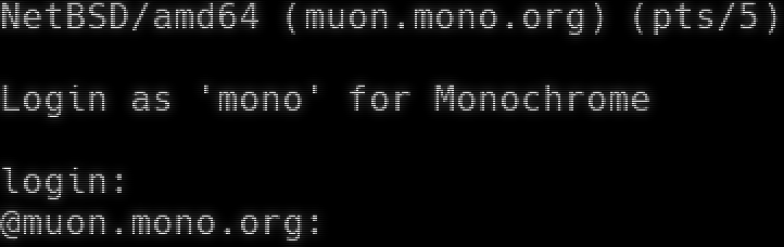 NetBSD/amd64 (muon.mono.org) (pts/5) Login as 'mono' for Monochrome login: Password for @muon.mono.org: