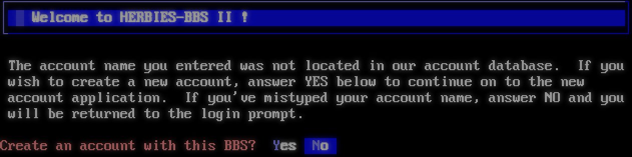 Mystic BBS Version 1.12 A49 Copyright (C) 1997-2023 By James Coyle Detecting terminal emulation: ANSI detected. ──┬── ╓──┐ ╥──┐ ╖ ╓─┐ ╓─────┐ ╓──┐ ╓─╥─┐ ╥──┐ ╥ ┬ ╓─╥─┐ ╥──┐ ╥──┐ │ ║ │ ╟─ ╜ ╙─┐ ║ ║ │ ║ ║ │ ╟──┘ ║ │ ║ ╟─ ╟─┬┘ │ ╙──┘ ╨──┘ ╙──┘ ║ ╙──┘ ╨ ╨ ┴ ╨ ╙──┘ ╨ ╨──┘ ╨ ┴ │ ║ ╙───┘ SysOp: Joe Schweier ╙─────┘ │ ╥────┐ ╥────┐ ╓─────┐ AKA IB JOE ┌─┼── ║ │ ║ │ ║ └─┘ ╟────┴┐ ╟────┴┐ ╙─────┐ ║ │ ║ │ │ ▌ ╨─────┘ ╨─────┘ ╙─────┘ Dial Up ▌ ▌ 705.555.1212 ▄▄▌ ▌_​____\\ @Local Date & Time Modem ▄▄▌ ▄▄▄▄[█▌▄▄██▄▄_\\_​____ 03/06/26 at 08:15p USR V.Everything ▄▄▄▌ _​____________________) Node# 2 of 10 Access ▄▄▄▄▄▄▌ ■║██████████████████( Active Nodes:1 Telnet/WWW/FTP ▄▄▄▄▄▄▄▌ ╣██████████████████│ Mystic BBS Location ▀▒▀ ■║█████████ ███████│ @Version:1.12 A49 Edmonton, Ab. Can. ■▒ ╝██████████ ██████│ @Running On:Windows Crystal River, Fl.0▀0▀0 ───▀▀▀▀▀▀▀▀▀▀▀▀▀───└────────────────■ ▀▀▀▀▀▀▀▀▀▀▀▀▀▀▀▀▀▀▀▀▀▀▀▀▀▀▀▀▀▀▀▀▀▀▀▀▀▀▀▀▀▀▀▀▀▀▀▀▀▀▀▀▀▀▀▀▀▀▀▀▀▀▀▀ [■] Enter your user name: ┌─────────────────────────────────────────────────────────────────────────────┐ │ ▒ Welcome to Mystic BBS Demo System │ └─────────────────────────────────────────────────────────────────────────────┘ The account name you entered was not located in our account database. If you wish to create a new account, answer YES below to continue on to the new account application. If you've mistyped your account name, answer NO and you will be returned to the login prompt. Create an account with this BBS? Yes No