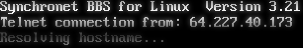 Synchronet BBS for Linux Version 3.21 Telnet connection from: 64.227.40.173 Resolving hostname...