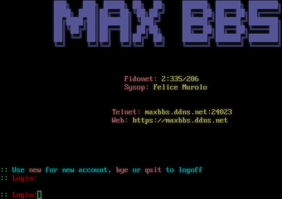 You are connected from 64.227.40.173:52228 This BBS uses CP437 charset and ANSI graphics. Check your terminal software settings. Felixia v1.3a (c) 2021-2024 by Felice Murolo Press RETURN to continue ███╗ ███╗ █████╗ ██╗ ██╗ ██████╗ ██████╗ ███████╗ ████╗ ████║██╔══██╗╚██╗██╔╝ ██╔══██╗██╔══██╗██╔════╝ ██╔████╔██║███████║ ╚███╔╝ ██████╔╝██████╔╝███████╗ ██║╚██╔╝██║██╔══██║ ██╔██╗ ██╔══██╗██╔══██╗╚════██║ ██║ ╚═╝ ██║██║ ██║██╔╝ ██╗ ██████╔╝██████╔╝███████║ ╚═╝ ╚═╝╚═╝ ╚═╝╚═╝ ╚═╝ ╚═════╝ ╚═════╝ ╚══════╝ Sometimes they come back Fidonet: 2:335/206 Sysop: Felice Murolo Telnet: maxbbs.ddns.net:24023 Web: https://maxbbs.ddns.net ██ :: Use new for new account, bye or quit to logoff :: Login: :: Login: