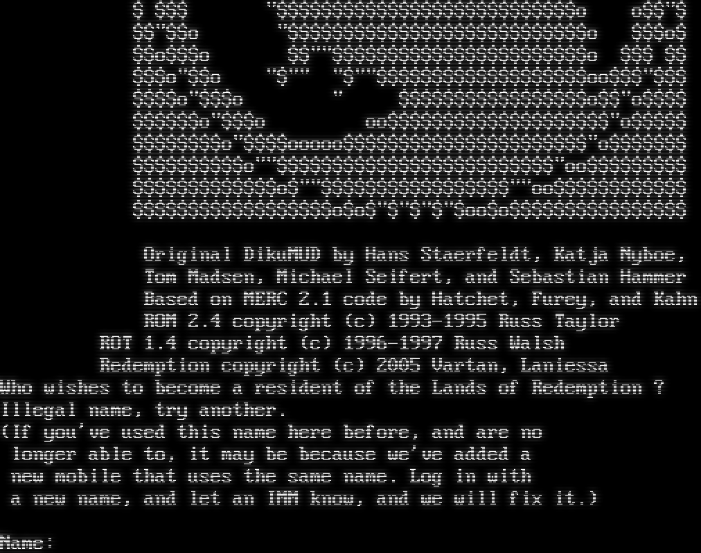 . The Lands of Redemption $$$$$$$$$$$$$$$$""$o$o$o$o$o$oo$$""$$$$$$$$$$$$$$$ $$$$$$$$$$$$""o$$$$$$$$$$"$"$$$$$$$o$"$$$$$$$$$$$$ $$$$$$$$$"$o$$$$""$oo $ "" """$$$oo"$$$$$$$$$ $$$$$$$"o$$$$" ""o $oo o o ""$$$o"$$$$$$$ $$$$$"o$$$" oo$$$$$$$$$$o "$$$o"$$$$$ $$$$"o$$$ $ o$$$$$$$$$$$$$$"$$oo "$$$ $$$$ $$$"$$$" "$$$$$$$$$$$$$$$$o$o$$$" $$$o$$$ $$ $$$ o$$$$$$$$$$$$$$$$$$$$$$$$o o o "$$o"$ $"$$$" o$$$$$$$$$"$$$$$$"" "$$$$$$"$$$$$ $$$"$ $o$$" o$$$$$$$$$$o""$$$"​"""ooo"$$$$$$$$" $$$" $o$$" o$$$$$$$$$$ ""oo"$"$o"" $$$o o$$$ o$$$$$$$$$$ "​""""$ o$$o o$$$ o$$$$$$$$$$$$o "o "oo$$o o$$$ oo$$$$$$$$$$$$$$$$ooooooo$$$$$oo $"$ "$$o o$$$" "" $$$$$$$$$$$$$$$$$$$$$$$$$$$$o " $$$ $ $$$ "$$$$$$$$$$$$$$$$$$$$$$$$$$$o o$$"$ $$"$$o "$$$$$$$$$$$$$$$$$$$$$$$$$$$o $$$o$ $$o$$$o $$""$$$$$$$$$$$$$$$$$$$$$$$o $$$ $$ $$$o"$$o "$"" "$""$$$$$$$$$$$$$$$$$$$oo$$$"$$$ $$$$o"$$$o " $$$$$$$$$$$$$$$$$o$$"o$$$$ $$$$$$o"$$$o oo$$$$$$$$$$$$$$$$$$$$"o$$$$$ $$$$$$$$o"$$$$ooooo$$$$$$$$$$$$$$$$$$$$$$"o$$$$$$$ $$$$$$$$$$o""$$$$$$$$$$$$$$$$$$$$$$$$$"oo$$$$$$$$$ $$$$$$$$$$$$$o$""$$$$$$$$$$$$$$$$$""oo$$$$$$$$$$$$ $$$$$$$$$$$$$$$$$$o$o$"$"$"$"$oo$o$$$$$$$$$$$$$$$$ Original DikuMUD by Hans Staerfeldt, Katja Nyboe, Tom Madsen, Michael Seifert, and Sebastian Hammer Based on MERC 2.1 code by Hatchet, Furey, and Kahn ROM 2.4 copyright (c) 1993-1995 Russ Taylor ROT 1.4 copyright (c) 1996-1997 Russ Walsh Redemption copyright (c) 2005 Vartan, Laniessa Who wishes to become a resident of the Lands of Redemption ? Illegal name, try another. (If you've used this name here before, and are no longer able to, it may be because we've added a new mobile that uses the same name. Log in with a new name, and let an IMM know, and we will fix it.) Name: