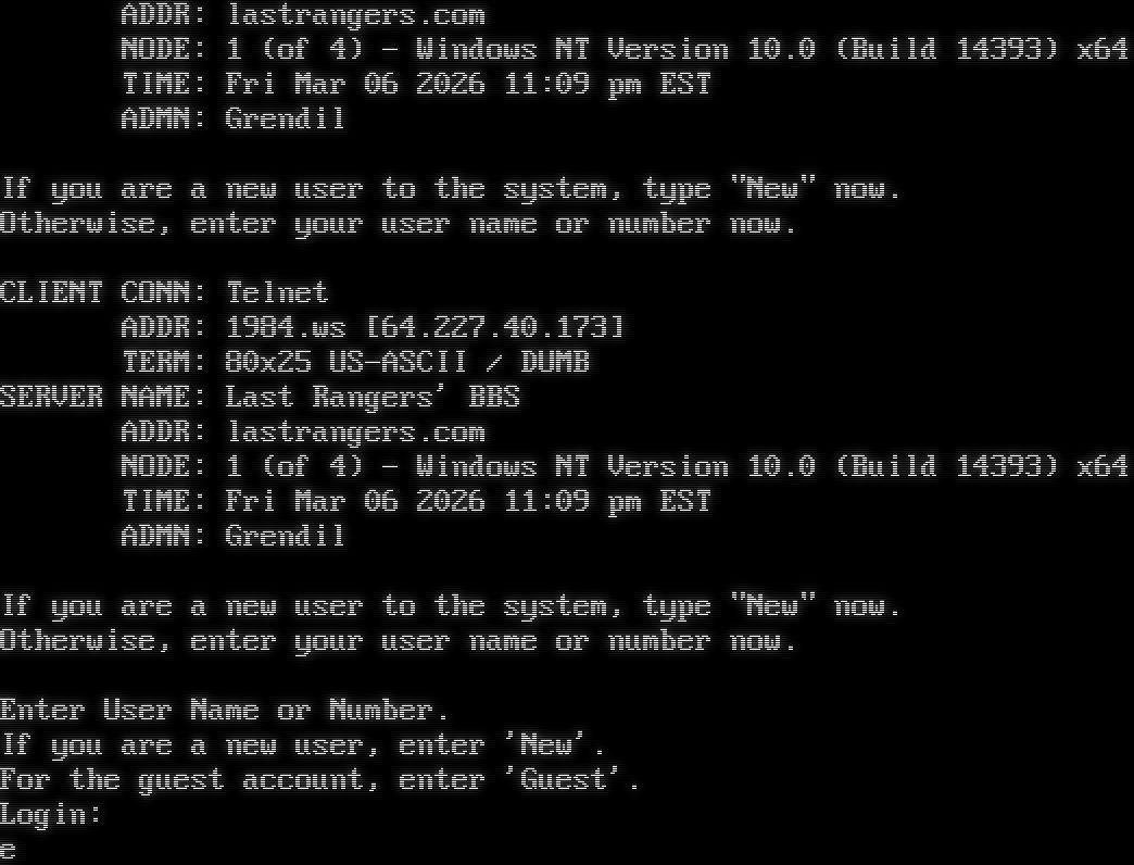 Synchronet BBS for Win32 Version 3.20 Telnet connection from: 64.227.40.173 Resolving hostname... _ _ Synchronet BBS for Win32 Version 3.20 Copyright 2025 Rob Swindell CLIENT CONN: Telnet ADDR: 1984.ws [64.227.40.173] TERM: 80x25 US-ASCII / DUMB SERVER NAME: Last Rangers' BBS ADDR: lastrangers.com NODE: 1 (of 4) - Windows NT Version 10.0 (Build 14393) x64 TIME: Fri Mar 06 2026 11:09 pm EST ADMN: Grendil If you are a new user to the system, type "New" now. Otherwise, enter your user name or number now. CLIENT CONN: Telnet ADDR: 1984.ws [64.227.40.173] TERM: 80x25 US-ASCII / DUMB SERVER NAME: Last Rangers' BBS ADDR: lastrangers.com NODE: 1 (of 4) - Windows NT Version 10.0 (Build 14393) x64 TIME: Fri Mar 06 2026 11:09 pm EST ADMN: Grendil If you are a new user to the system, type "New" now. Otherwise, enter your user name or number now. Enter User Name or Number. If you are a new user, enter 'New'. For the guest account, enter 'Guest'. Login: Bee