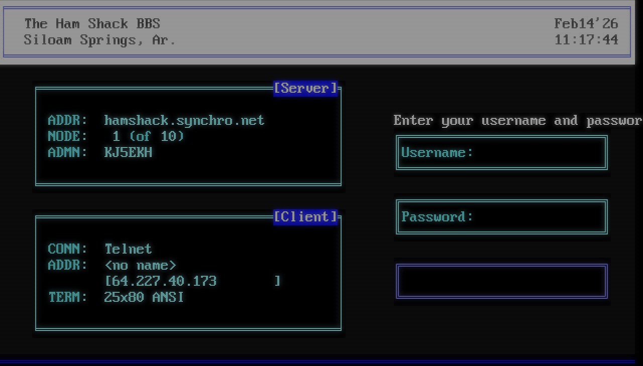 Synchronet BBS for Linux Version 3.21 Telnet connection from: 64.227.40.173 Resolving hostname... _  Synchronet BBS for Linux Version 3.21 Copyright 2026 Rob Swindell ┌╦═══╦┐ ┌╦╦┐ ┌╦═╗ ╦┐ ┌╦═══╦┐ ┌╦╦┐ ┌╦═══╦┐ ┌╦═══╦┐ ┌╦═╗ ╦┐ ┌╦═══╦┐ ┌═╤╦╤═┐ └╩═══╦┐ └╩╤╦╤╩┘ │║ ║ ║│ │║├╬═══╬┤ │╠══╦╩┘ │║║│ │║ ║ ║│ ├╬══│║│ └╩═══╩┘└╩┘└╩ ╚═╩┘ └╩═══╩┘ └╩╩┘ └╩ ╚═┘ └╩═══╩┘ └╩ ╚═╩┘ └╩═══╩┘╧╩╧ CLIENT CONN: Telnet ADDR: <no name> [64.227.40.173] TERM: 80x25 UTF-8 / ANSI SERVER NAME: The Ham Shack BBS ADDR: hamshack.synchro.net NODE: 1 (of 10) - Ubuntu 24.04.3 LTS x86_64 TIME: Sat Feb 14 2026 11:17:42 UTC-6:00 ADMN: KJ5EKH If you are a new user to the system, type "New" now. Otherwise, enter your user name or number now. One moment please...╒═════════════════════════════════════════════════════════════════════════════╕ │ The Ham Shack BBS Feb14'26 │ │ Siloam Springs, Ar. 11:17:42 │ ╘═════════════════════════════════════════════════════════════════════════════╛ ░░░░░░░░░░░░░░░░░░░░░░░░░░░░░░░░░░░░░░░░░░░░░░░░░░░░░░░░░░░░░░░░░░░░░░░░░░░░░░░ ░░░░╒═════════════════════════════[Server]╕░░░░░░░░░░░░░░░░░░░░░░░░░░░░░░░░░░░░ ░░░░││░░░░░░░░░░░░░░░░░░░░░░░░░░░░░░░░░░░░ ░░░░│ ADDR: hamshack.synchro.net │░░░░░░░░░░░░░░░░░░░░░░░░░░░░░░░░░░░░ ░░░░│ NODE: 1 (of 10) │░░░░░░░░░░░░░░░░░░░░░░░░░░░░░░░░░░░░ ░░░░│ ADMN: KJ5EKH │░░░░░░░░░░░░░░░░░░░░░░░░░░░░░░░░░░░░ ░░░░││░░░░░░░░░░░░░░░░░░░░░░░░░░░░░░░░░░░░ ░░░░╘═════════════════════════════════════╛░░░░░░░░░░░░░░░░░░░░░░░░░░░░░░░░░░░░ ░░░░░░░░░░░░░░░░░░░░░░░░░░░░░░░░░░░░░░░░░░░░░░░░░░░░░░░░░░░░░░░░░░░░░░░░░░░░░░░ ░░░░╒═════════════════════════════[Client]╕░░░░░░░░░░░░░░░░░░░░░░░░░░░░░░░░░░░░ ░░░░││░░░░░░░░░░░░░░░░░░░░░░░░░░░░░░░░░░░░ ░░░░│ CONN: Telnet │░░░░░░░░░░░░░░░░░░░░░░░░░░░░░░░░░░░░ ░░░░│ ADDR: <no name> │░░░░░░░░░░░░░░░░░░░░░░░░░░░░░░░░░░░░ ░░░░│[64.227.40.173 ] │░░░░░░░░░░░░░░░░░░░░░░░░░░░░░░░░░░░░ ░░░░│ TERM: 25x80 ANSI │░░░░░░░░░░░░░░░░░░░░░░░░░░░░░░░░░░░░ ░░░░││░░░░░░░░░░░░░░░░░░░░░░░░░░░░░░░░░░░░ ░░░░╘═════════════════════════════════════╛░░░░░░░░░░░░░░░░░░░░░░░░░░░░░░░░░░░░ ░░░░░░░░░░░░░░░░░░░░░░░░░░░░░░░░░░░░░░░░░░░░░░░░░░░░░░░░░░░░░░░░░░░░░░░░░░░░░░░ ═══════════════════════════════════════════════════════════════════════════════ ╔═════════════════╗╚═════════════════╝║║║║║║║║║║║║║║Log in New user Guest account Retrieve passwordEmail the sysop Page the sysop Disconnect ╒═════════════════════════════════════════════════════════════════════════════╕ │ The Ham Shack BBS Feb14'26 │ │ Siloam Springs, Ar. 11:17:44 │ ╘═════════════════════════════════════════════════════════════════════════════╛ ░░░░░░░░░░░░░░░░░░░░░░░░░░░░░░░░░░░░░░░░░░░░░░░░░░░░░░░░░░░░░░░░░░░░░