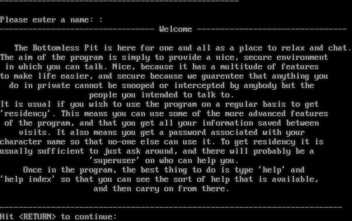 -​-------------------------------------------------- m.​......mMMMMMMMMMMMMMMMMMm.​......m MMMm.​.......MMm.​....mMm.​.......mMMM MMMMMMm.​....................mMMMMMM T B MMMMMMMMm.​.................mMMMMMMM h o MMMMMMMm.​....................mMMMMM e t Mm.​..............................mM t .​.....mMMM...88o...o88...MMMm.​..... o mmMMMMM.​.....888o.o888.​.....MMMMMmm m MMMMMM.​......8888.8888.​......MMMMMM l MMMM.​...M.​...8888.8888.​...M.​...MMMM e MM...mMMMm...888...888...mMMMm...MM s M..MMMMMMMMM.​..........MMMMMMMMM..M s P MmMMMMMMMMMM.​..........MMMMMMMMMMmM i MMMMMMMMMMMM.​..........MMMMMMMMMMMM t MMMMMMMMMMMM.​...MMMM...MMMMMMMMMMMM MMMMMMMMMMMMM...MMM...MMMMMMMMMMMMM ASCII Art (c)2008, spot HC Admin: Ginny, Trinity Coders: DarkGoddess, enyc, Ghostrider Admin: starry -​-------------------------------------------------- Please enter a name: : -​-------------------------------- Welcome -​------------------------------- The Bottomless Pit is here for one and all as a place to relax and chat. The aim of the program is simply to provide a nice, secure environment in which you can talk. Nice, because it has a multitude of features to make life easier, and secure because we guarentee that anything you do in private cannot be snooped or intercepted by anybody but the people you intended to talk to. It is usual if you wish to use the program on a regular basis to get 'residency'. This means you can use some of the more advanced features of the program, and that you get all your information saved between visits. It also means you get a password associated with your character name so that no-one else can use it. To get residency it is usually sufficient to just ask around, and there will probably be a 'superuser' on who can help you. Once in the program, the best thing to do is type 'help' and 'help index' so that you can see the sort of help that is available, and then carry on from there. -​------------------------------------------------------------------------ Hit <RETURN> to continue: