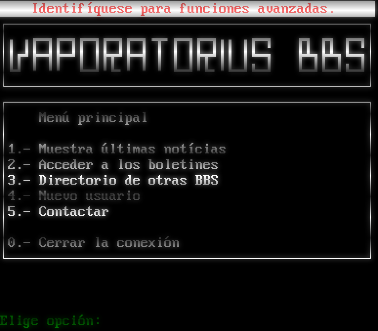 Type of terminal [Telnet,Retroterm]: Usuario desconocido. Identifíquese para funciones avanzadas. ┌──────────────────────────────────────────────┐ │╻ ╻┏━┓┏━┓┏━┓┏━┓┏━┓╺┳╸┏━┓┏━┓╻╻ ╻┏━┓ ┏┓ ┏┓ ┏━┓│ │┃┏┛┣━┫┣━┛┃ ┃┣┳┛┣━┫ ┃ ┃ ┃┣┳┛┃┃ ┃┗━┓ ┣┻┓┣┻┓┗━┓│ │┗┛ ╹ ╹╹ ┗━┛╹┗╸╹ ╹ ╹ ┗━┛╹┗╸╹┗━┛┗━┛ ┗━┛┗━┛┗━┛│ └──────────────────────────────────────────────┘ ┌──────────────────────────────────────────────┐ │ Menú principal │ │ │ │1.- Muestra últimas notícias │ │2.- Acceder a los boletines │ │3.- Directorio de otras BBS │ │4.- Nuevo usuario │ │5.- Contactar │ │ │ │0.- Cerrar la conexión │ └──────────────────────────────────────────────┘ Elige opción: