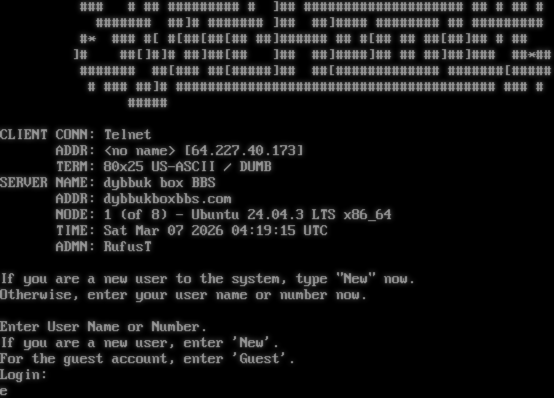 Synchronet BBS for Linux Version 3.21 Telnet connection from: 64.227.40.173 _ ∩╗┐ Synchronet BBS for Linux Version 3.21 Copyright 2026 Rob Swindell #​######################### ### #​####################]#​######################### #​############ #​##### ## ### ## ###[## ##]#​########## ###[#​#### [ #​############ #​###########[]#​###]# ## ##]###]#​############### ]#​######## ]## #​############### gj#​########### ### #​###### ### ### ## #[## #​######]# #​#### ]## ###bbs software# #​###################[## #​### #]### ## #​############### # #​##################### CLIENT CONN: Telnet ADDR: <no name> [64.227.40.173] TERM: 80x25 US-ASCII / DUMB SERVER NAME: dybbuk box BBS ADDR: dybbukboxbbs.com NODE: 1 (of 8) - Ubuntu 24.04.3 LTS x86_64 TIME: Sat Mar 07 2026 04:19:15 UTC ADMN: RufusT If you are a new user to the system, type "New" now. Otherwise, enter your user name or number now. #​#### #​#### # ### # ## #​######## # ]## #​################### ## # ## # #​###### ##]# #​###### ]## ##]#​### #​####### ## #​######## #\* ### #[ #[##[##[## ##]#​##### ## #[## ## ##[##]## # ## ]# ##[]#]# ##]##[## ]## ##]#​###]## ## ##]##]### ##\*## #​###### ##[### ##[#​####]## ##[#​############ #​######[#​#### # ### ##]# #​####################################### ### # #​#### CLIENT CONN: Telnet ADDR: <no name> [64.227.40.173] TERM: 80x25 US-ASCII / DUMB SERVER NAME: dybbuk box BBS ADDR: dybbukboxbbs.com NODE: 1 (of 8) - Ubuntu 24.04.3 LTS x86_64 TIME: Sat Mar 07 2026 04:19:15 UTC ADMN: RufusT If you are a new user to the system, type "New" now. Otherwise, enter your user name or number now. Enter User Name or Number. If you are a new user, enter 'New'. For the guest account, enter 'Guest'. Login: Bee