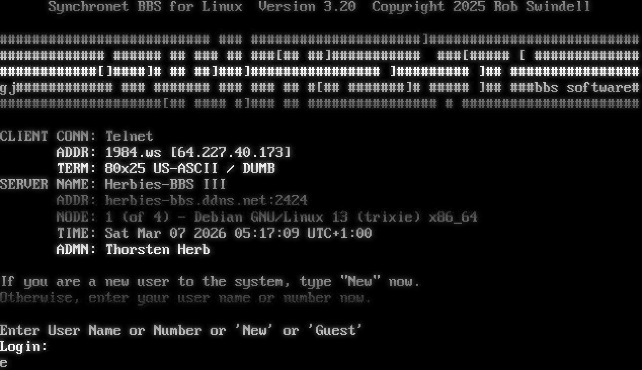 Synchronet BBS for Linux Version 3.20 Telnet connection from: 64.227.40.173 Resolving hostname... _ _ Synchronet BBS for Linux Version 3.20 Copyright 2025 Rob Swindell #​######################### ### #​####################]#​######################### #​############ #​##### ## ### ## ###[## ##]#​########## ###[#​#### [ #​############ #​###########[]#​###]# ## ##]###]#​############### ]#​######## ]## #​############### gj#​########### ### #​###### ### ### ## #[## #​######]# #​#### ]## ###bbs software# #​###################[## #​### #]### ## #​############### # #​##################### CLIENT CONN: Telnet ADDR: 1984.ws [64.227.40.173] TERM: 80x25 US-ASCII / DUMB SERVER NAME: Herbies-BBS III ADDR: herbies-bbs.ddns.net:2424 NODE: 1 (of 4) - Debian GNU/Linux 13 (trixie) x86_64 TIME: Sat Mar 07 2026 05:17:09 UTC+1:00 ADMN: Thorsten Herb If you are a new user to the system, type "New" now. Otherwise, enter your user name or number now. NN: Enter User Name or Number or 'New' or 'Guest' Login: Bee