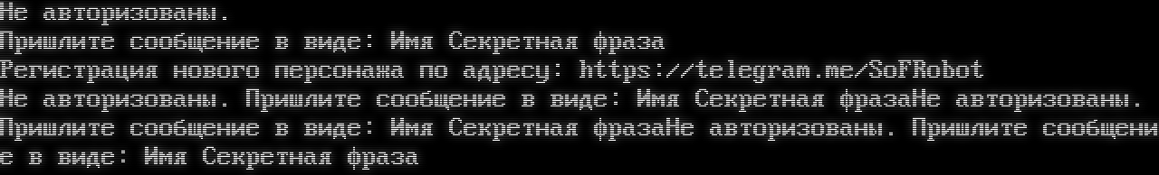 Не авторизованы. Пришлите сообщение в виде: Имя Секретная фраза Регистрация нового персонажа по адресу: https://telegram.me/SoFRobot Не авторизованы. Пришлите сообщение в виде: Имя Секретная фразаНе авторизованы. Пришлите сообщение в виде: Имя Секретная фразаНе авторизованы. Пришлите сообщение в виде: Имя Секретная фраза