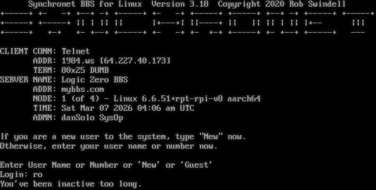 Synchronet BBS for Linux Version 3.18 Telnet connection from: 64.227.40.173 Resolving hostname... _ ∩╗┐_ Synchronet BBS for Linux Version 3.18 Copyright 2020 Rob Swindell +​-----+ +- -+ +​--+ -+ +​-----+ +- -+ +​-----+ +​-----+ +​--+ -+ +​-----+ +​-----+ +​-----+ +​-----+ \|\| \| \|\| \|\| \|+​---+\| \|\|-​---+ \|\| \|\| \|\| \| \|\| \|+-- \|\|\| +​-----+ +-+ +- +​--+ +​-----+ +- -+ +- +-+ +​-----+ +- +​--+ +​-----+ --- CLIENT CONN: Telnet ADDR: 1984.ws [64.227.40.173] TERM: 80x25 DUMB SERVER NAME: Logic Zero BBS ADDR: mybbs.com NODE: 1 (of 4) - Linux 6.6.51+rpt-rpi-v8 aarch64 TIME: Sat Mar 07 2026 04:06 am UTC ADMN: danSolo SysOp If you are a new user to the system, type "New" now. Otherwise, enter your user name or number now. Enter User Name or Number or 'New' or 'Guest' Login: ro You've been inactive too long.